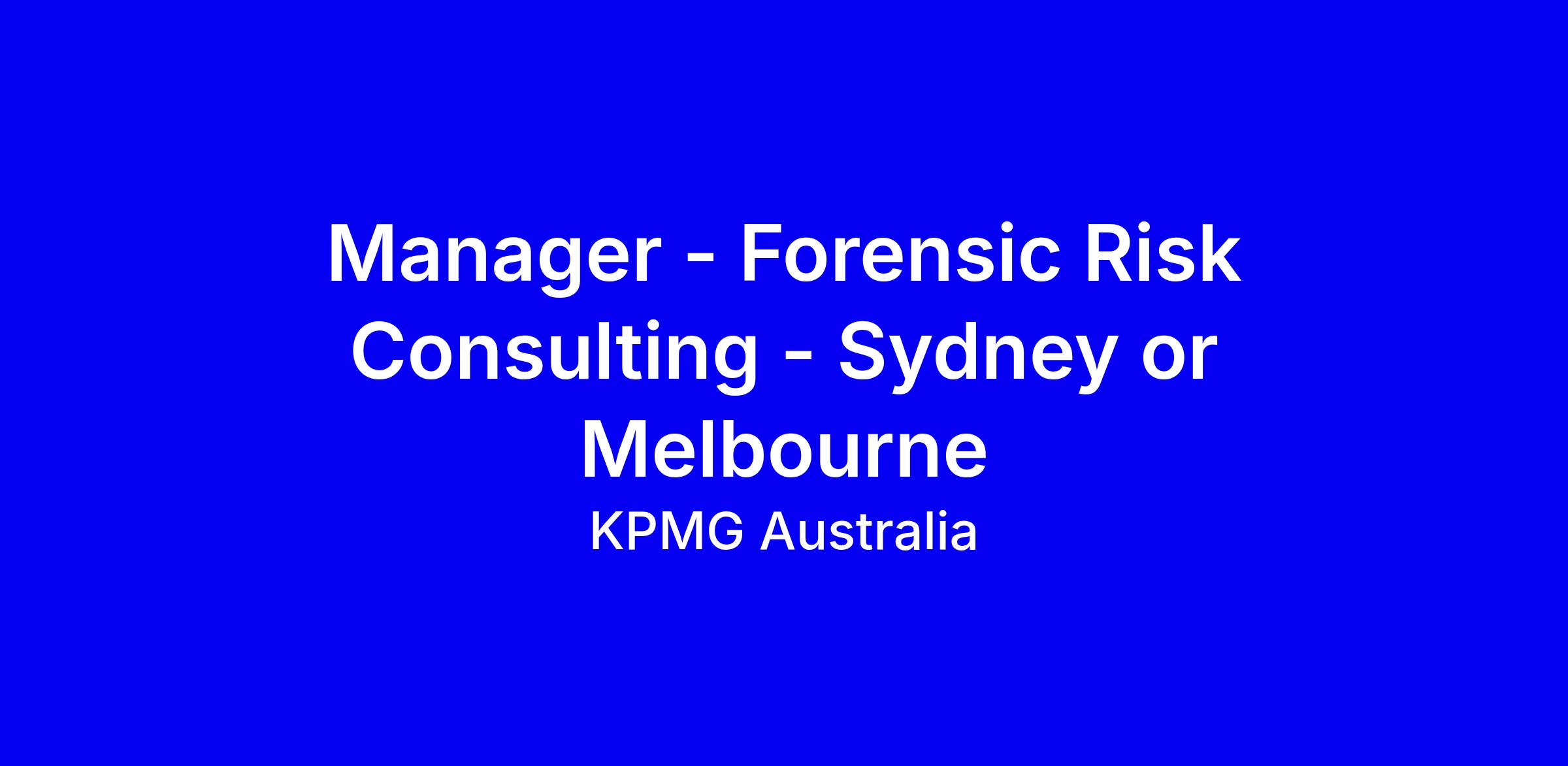 KPMG Australia is hiring a Manager in Forensic Risk Consulting based in Sydney or Melbourne, full-time and onsite. The posting highlights global reach, deep sector experience, and a culture that values diverse thinking, collaboration, and meaningful, impactful work. It also promotes flexible hours and locations, generous parental leave, career breaks, learning opportunities and other perks, underscoring an inclusive, equitable environment. For applicants, emphasize leadership in forensic risk projects, investigations, regulatory and AML/risk experience, client delivery, and tangible outcomes; show stakeholder collaboration and project management skills. If adjustments are needed, contact Talent Attraction Support Team. Every career at KPMG is different and growth awaits.