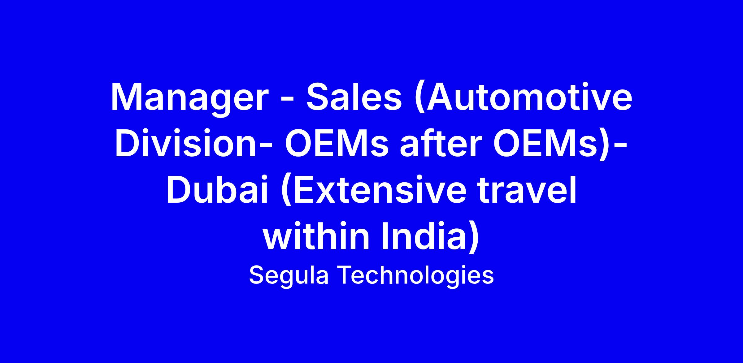 Segula Technologies is seeking a motivated Manager - Sales for its Automotive division, based in India with Dubai reporting lines and extensive travel within India, to drive accessories sales, identify new market opportunities, and manage the OEM sales pipeline. The role requires lead generation, client engagement, cross-functional collaboration, and the ability to work autonomously in a fast paced environment. Ideal candidates have 5-7 years in automotive sales or business development, experience with OEM relationships, a mechanical engineering degree (MBA in Sales/Marketing a plus), and strong communication and organizational skills. To apply, tailor your CV to show concrete wins in lead generation, pipeline management, and revenue impact, quantify deals closed and forecast accuracy, highlight travel readiness and CRM proficiency. Only shortlisted candidates will be contacted.