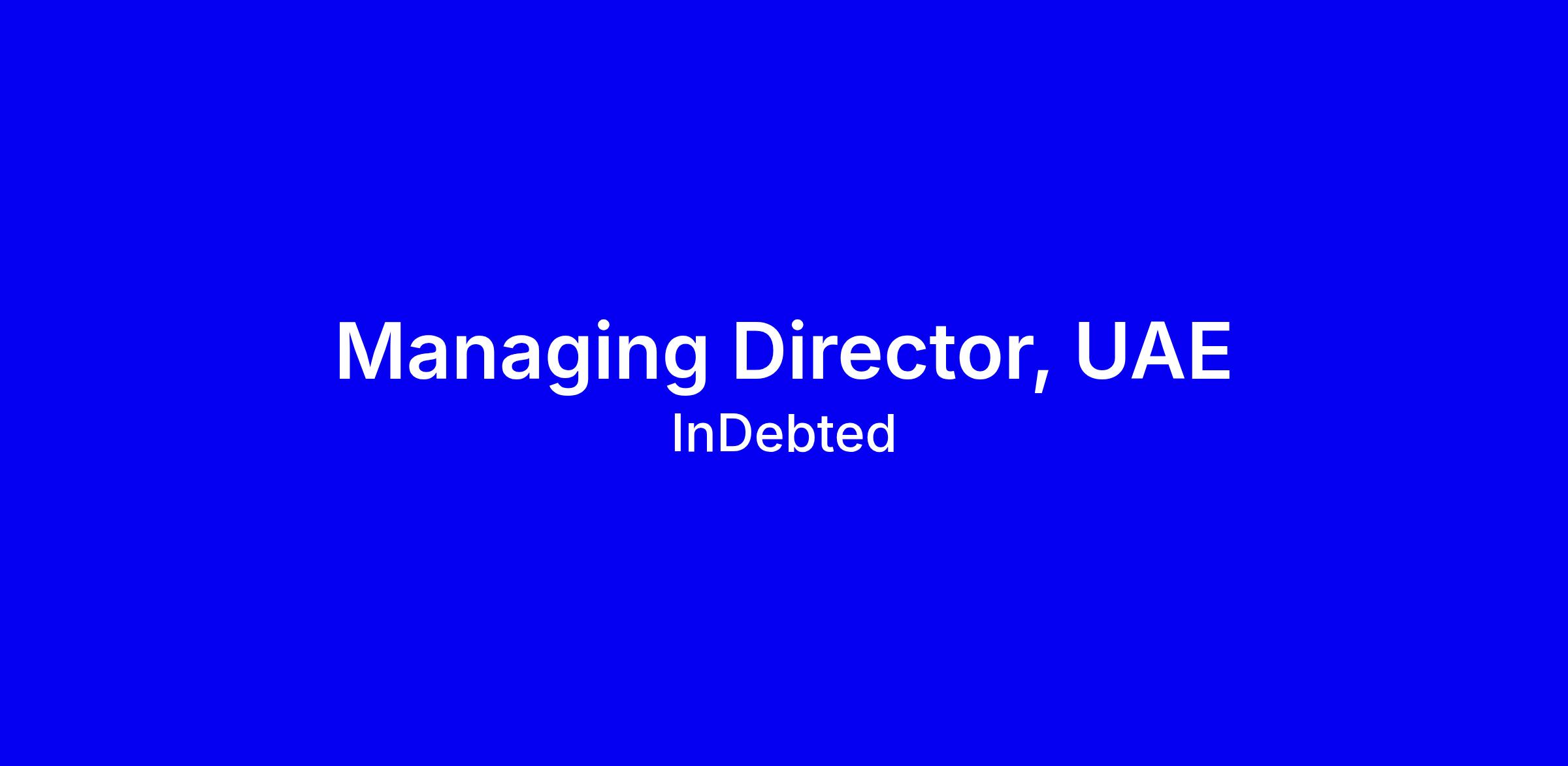 As a global leader in digital, compliance-led collections, InDebted partners with the world’s most innovative enterprises to modernise recovery, protect brand equity, and transform the customer experience. We are now bringing that model to the UAE through a new joint venture anchored by ADCB — and we are hiring a Managing Director to lead and scale our presence in one of our most important new markets.This is a senior, high-impact leadership role responsible for owning the UAE P&L, driving enterprise growth across banks/telcos/utilities/BNPLs, and establishing InDebted as the region’s benchmark for compliant, digital-first collections.About the Role:The Managing Director (UAE) is the senior-most leadership position for the market, accountable for commercial growth, operational performance, regulatory alignment, and long-term client relationships. You will lead the UAE go-to-market strategy, spearhead expansion beyond ADCB, and ensure we execute a relationship-driven enterprise entry model suited to the UAE market’s dynamics.You will build, lead, and manage a small but high-performing local team — including hiring and managing the Business Development Lead — while working closely with global product, compliance, operations, and executive leadership.