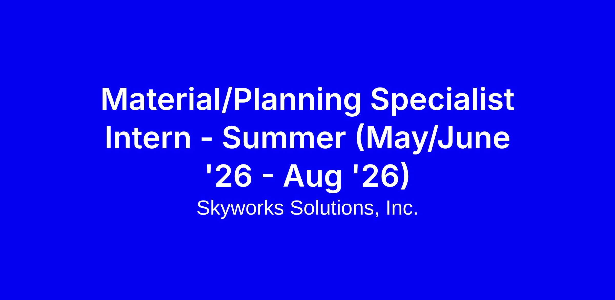 Skyworks Solutions seeks a Summer Material/Planning Intern in Austin, TX (onsite May to Aug 2026) to support NPI supply chain, monitor inventory, and ensure material quality. The role plans and tracks material flow through the engineering cycle, coordinates with purchasing and production, and maintains BOM and MRP data. You will use SAP Inventory/WMS, Ariba and Agile to streamline New Product Introduction and inform stakeholders. Ideal candidates hold a bachelor’s or master’s in Business, Industrial or Process Engineering, or SCM, with strong problem solving and communication. Please emphasize SAP/Ariba/Agile experience, cross functional collaboration, and Austin onsite readiness.