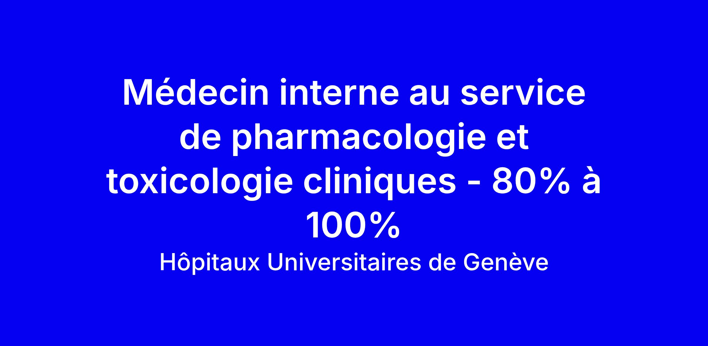Les Hôpitaux Universitaires de Genève recrutent un médecin interne au service de pharmacologie et toxicologie cliniques, à 80% à 100% et pour un CDD de 12 mois, en poste sur Genève. Le poste alterne consultations hospitalières et ambulatoires dans les domaines de l’information thérapeutique et toxicologique, de la pharmacogénomique et des thérapies personnalisées, avec pour objectif d’améliorer la gestion de la polymédication, des interactions et de l’observance chez les patients à risque, tout en participant à la pharmacovigilance et à des activités de recherche et formation. Profil: diplôme fédéral suisse ou équivalent MEBEKO, expérience clinique appréciée, excellente communication, autonomie, flexibilité et engagement; maîtrise du français C1 si non natif. Postulez uniquement via la plateforme de recrutement avant le 27 avril 2026, en joignant une lettre de motivation, votre CV, copies des diplômes et certificats. Pour plus d’informations contacter Prof. C. Samer.