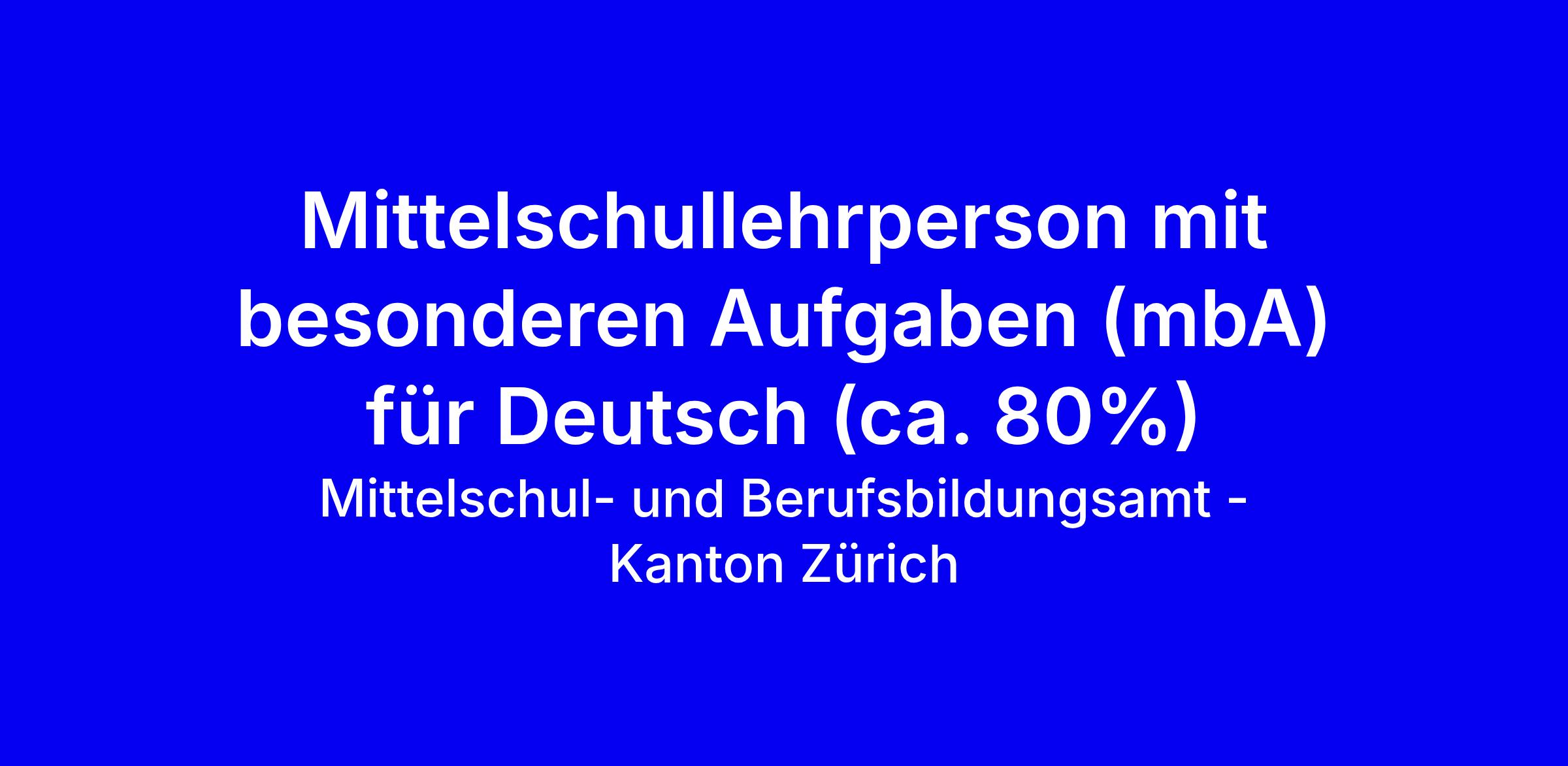 Auf Beginn des Herbstsemesters 2026/27 ist am Realgymnasium Rämibühl eine Stelle als Mittelschullehrperson mit besonderen Aufgaben (mbA) für Deutsch zu besetzen.Als Mittelschullehrperson «mit besonderen Aufgaben» möchten Sie sich mit Kreativität und Innovationsgeist in Projekte der pädagogischen Schulentwicklung einbringen und sind bereit, neben der Unterrichtstätigkeit auch Aufgaben im Rahmen Klassenführung und der Schulverwaltung zu übernehmen.