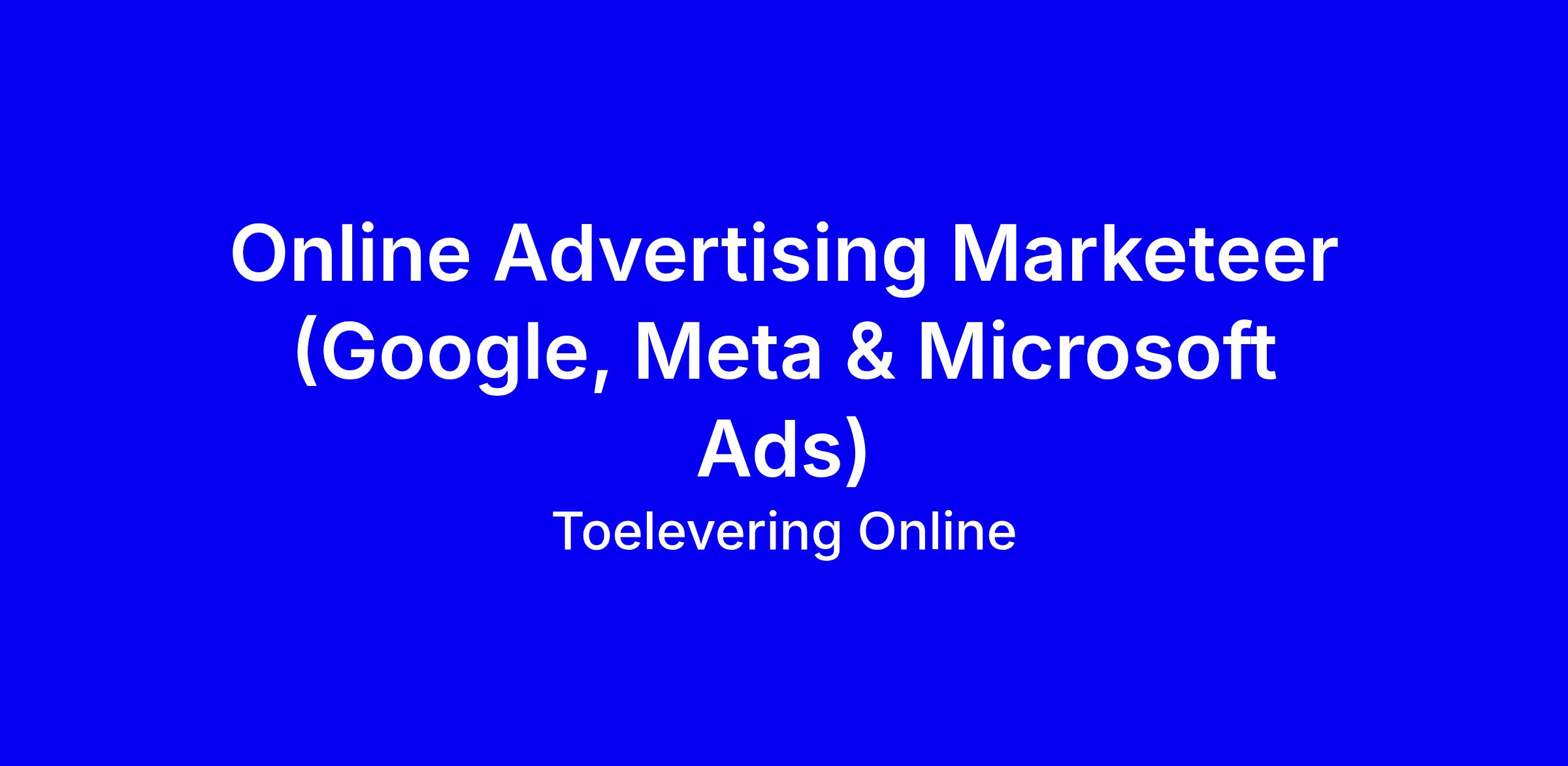 Toelevering Online zoekt een ervaren Online Advertising Marketeer om de dagelijkse performance van onze betaalde kanalen in de Nederlandse markt te sturen en te schalen, van Google Ads en Shopping tot Meta en Microsoft, inclusief productfeeds, met als doel ROAS, CPA en omzet te verbeteren en de groei van ons B2B e-commerce platform te versnellen. Je werkt nauw samen met de E-commerce Manager en een performance bureau, neemt ownership over uitvoering, A/B-testen en optimalisatie, en vertaalt strategische input naar concrete campagnes. Vereisten: HBO werk en denkniveau, minimaal drie jaar ervaring in online advertising, aantoonbare ervaring met Google Ads, Shopping en Meta, ervaring met feed management, sterk analytisch, proactief en hands-on. Aanbod: salaris tussen 3500 en 4500 euro, 37 vakantiedagen, hybride werken, ruimte voor ontwikkeling. Solliciteer via het formulier of neem contact op met Richard op 06-476 871 66.