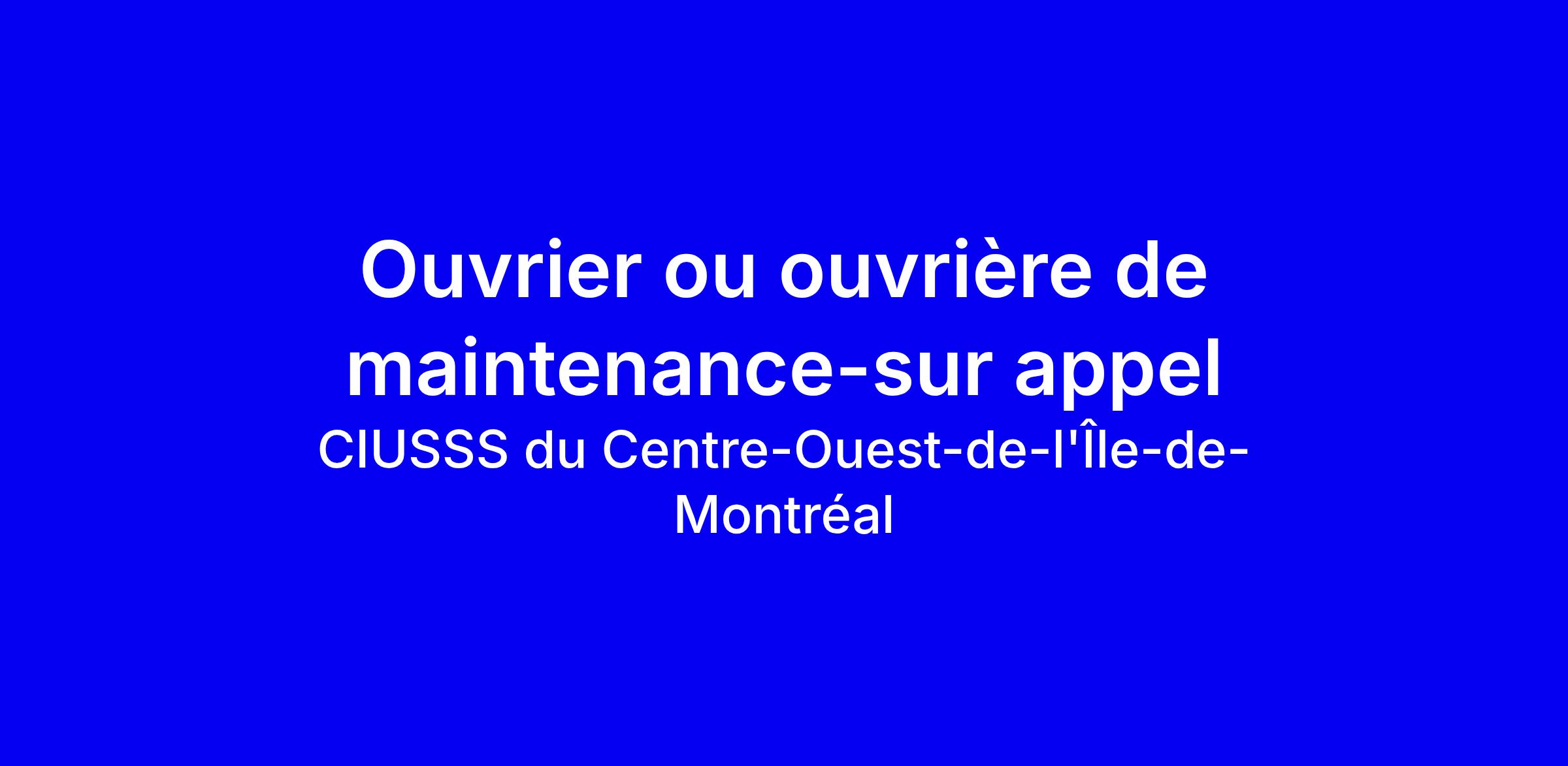 Offre d’Ouvrier ou ouvrière de maintenance sur appel au CIUSSS du Centre-Ouest-de-l’Île-de-Montréal, Montréal, poste temporaire à temps partiel syndiqué, quarts jour et soir, salaire de base 25,98 $/h. Responsabilités: entretien des installations et du matériel, service de première ligne pour le matériel médical, maintenance préventive et corrective, travaux de menuiserie, plomberie, serrurerie, peinture et plâtre, réparations simples et gestion d’outils. Exigences: une année d’expérience, français obligatoire, anglais un atout; sens de l’organisation, esprit d’équipe et professionnalisme. Pour postuler, adaptez votre CV en valorisant votre polyvalence technique et votre disponibilité jour et soir et montrez votre adhésion au cadre PAEE du CIUSSS.