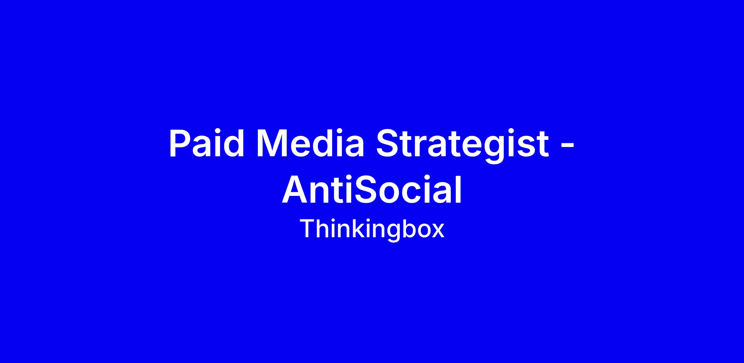 AntiSocial, part of Thinkingbox, is seeking a Paid Media Strategist for a full-time onsite role in Toronto. You will lead planning, execution, and optimization of paid social and digital campaigns across Meta, TikTok, YouTube, Google and emerging channels, owning budgets, pacing, and reporting while turning business goals into actionable media strategies. This role sits at the intersection of strategy, performance, and creative collaboration with content teams to shape messaging. Ideal candidates have 3+ years in paid media, hands on experience with Meta Ads Manager, Google Ads Manager and TikTok Ads Manager, strong data fluency, and clear communication. To apply, send your resume plus portfolio links; highlight wins and collaboration with creatives, and note that AntiSocial values inclusivity.