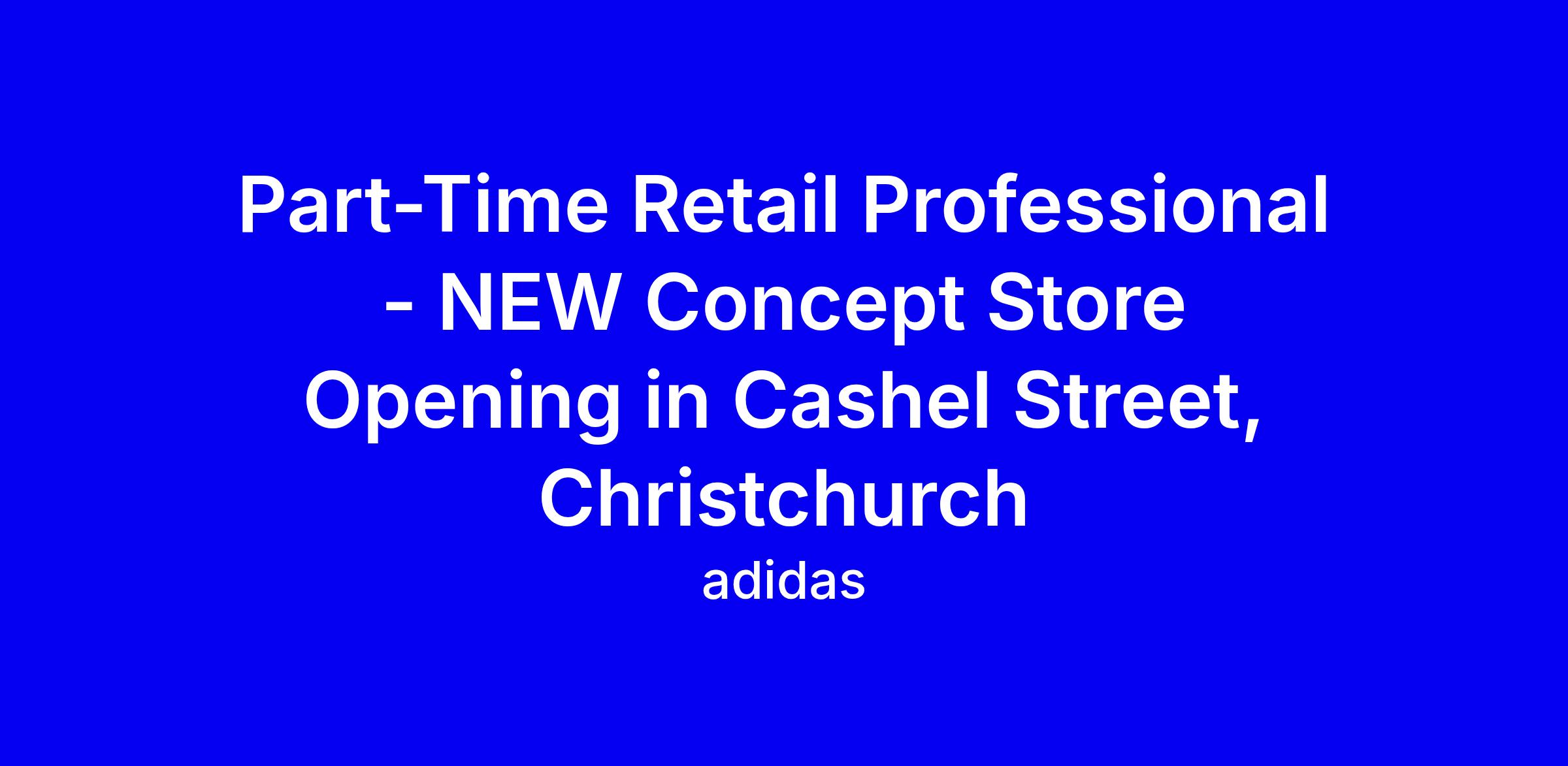 adidas is opening a NEW Concept Store on Cashel Street in Christchurch and is hiring a Part-Time Retail Professional. In this role you will drive store and personal sales targets, deliver Brand Customer Service standards, maintain Visual Merchandising, process deliveries quickly, and continually replenish stock with a focus on footwear while embodying the adidas brand values. The ideal candidate has solid retail sales or customer service experience, is motivated and energetic, and thrives in a fast paced environment. Expect about 38 hours per week across weekdays and weekends; please include your availability in the application. To apply, click Apply, complete the online form, attach your resume and a cover letter addressing the requirements, and confirm permanent rights to work in NZ or AU.