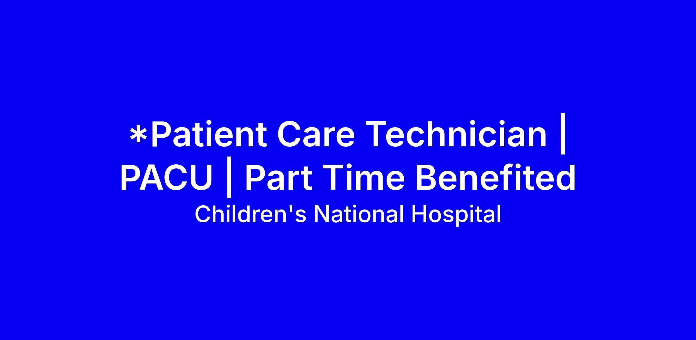 Children's National Hospital in Washington DC is hiring a Part Time Benefited Patient Care Technician for the PACU to work 11a-7p, 8-hour shifts with occasional weekends. The role supports RN-directed care, maintains a safe, clean patient care area, assists with patient flow, vital signs, ADLs, tube feeds, cultures, and basic procedures, and helps with discharge preparation while upholding infection control and safety standards. Requirements include a High School Diploma or GED, CPCT and BLS certifications, basic computer skills, and ideally one year of healthcare experience with pediatrics preferred. Emphasize teamwork, communication, reliability, and documentation in your application. Apply through the CN Taleo portal with a targeted resume and cover note highlighting pediatric care exposure and readiness for shift patterns.