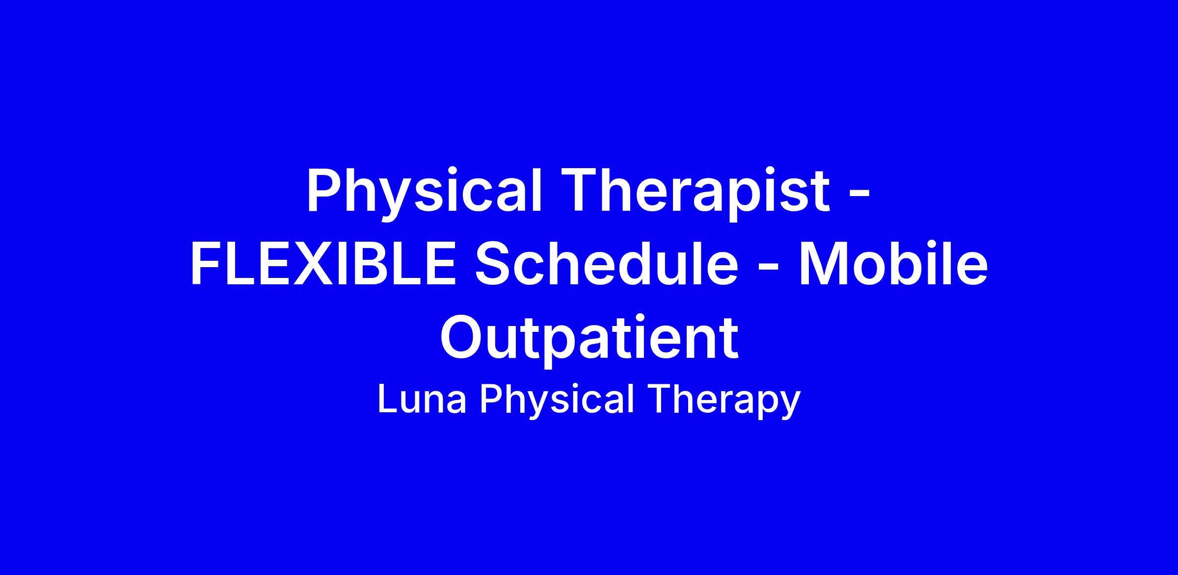 About Luna Founded in 2018, Luna has quickly emerged as the leading in-home tech-enabled physical therapy platform. Over 3000 PTs choose Luna to empower their practice by avoiding burnout and enabling renewed hope in their profession. Luna is proud to partner with outstanding organizations like Emory Health, Powerback, HopCo, Providence, Evergreen, Scripps, UCLA, AARP, and more - further solidifying our commitment to exceptional healthcare delivery. Learn more at www.getluna.com or simply apply here to express interest in speaking with a clinician from our therapist acquisition team! Job Description We are looking for experienced and collaborative clinicians to provide outpatient PT services to patients in their homes in