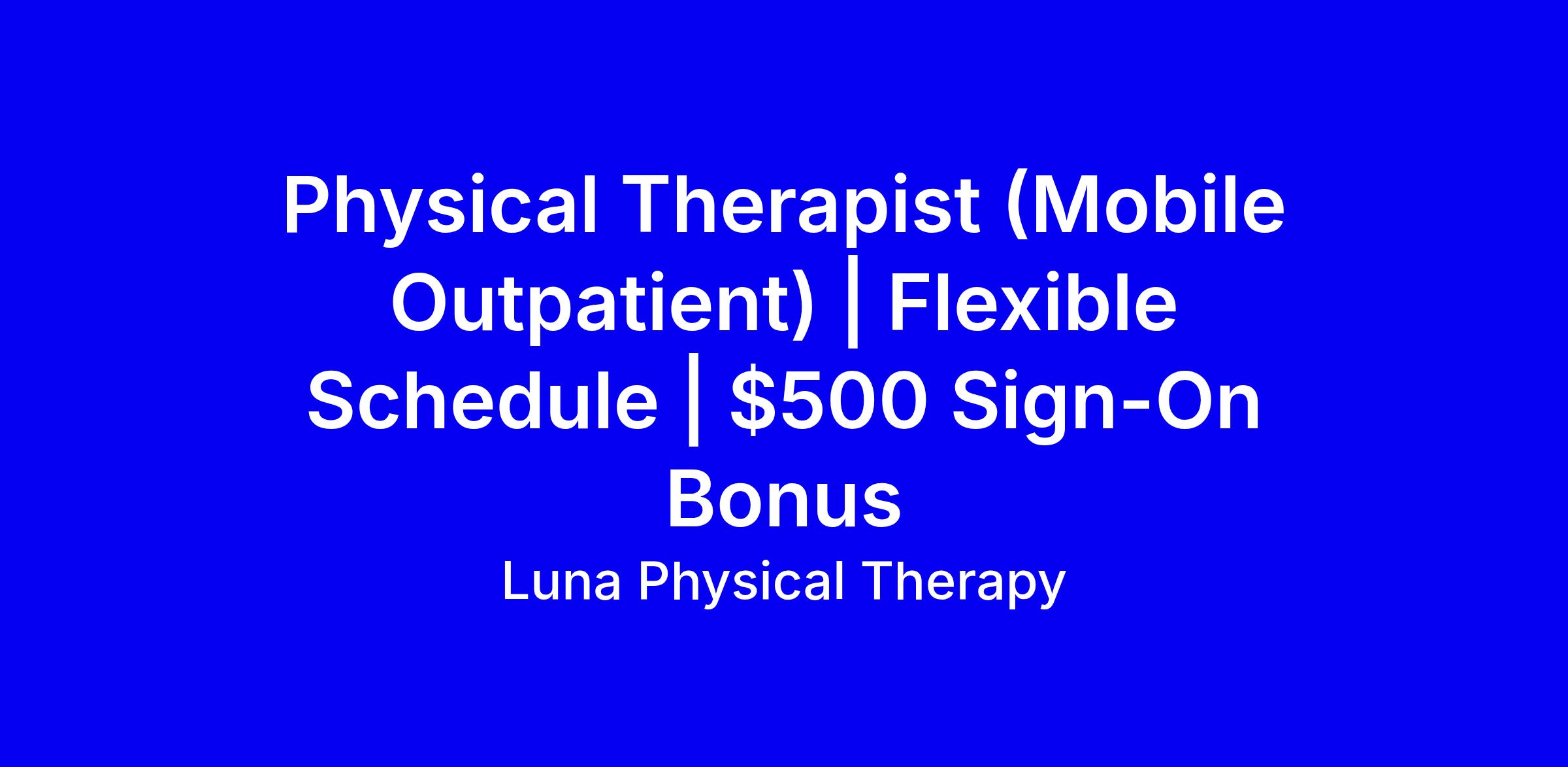 About Luna Founded in 2018, Luna has quickly emerged as the leading in-home tech-enabled physical therapy platform. Over 3000 PTs choose Luna to empower their practice by avoiding burnout and enabling renewed hope in their profession. Luna is proud to partner with outstanding organizations like Emory Health, Powerback, HopCo, Providence, Evergreen, Scripps, UCLA, AARP, and more - further solidifying our commitment to exceptional healthcare delivery. Learn more at www.getluna.com or simply apply here to express interest in speaking with a clinician from our therapist acquisition team! Job Description We are looking for experienced and collaborative clinicians to provide outpatient PT services to patients in their homes in