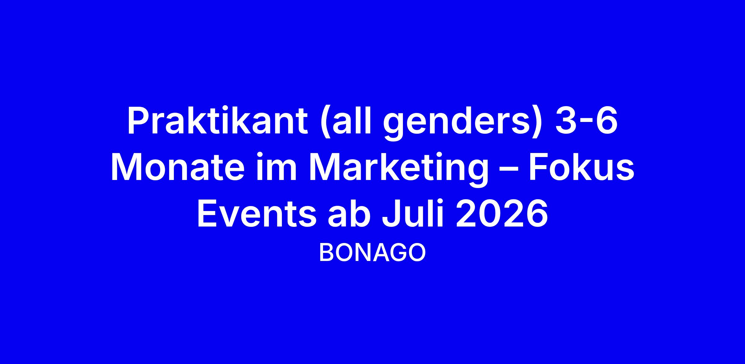BONAGO sucht ab Juli 2026 für 3-6 Monate einen Praktikanten (all genders) im Marketing mit Fokus Events in München. Du unterstützt das Marketing-Team im Tagesgeschäft, übernimmst eigenständige Projekte, führst Markt- und Wettbewerbsanalysen durch und hilfst bei der Planung nationaler Messen und Events bis zur Vor-Ort-Betreuung. Zu deinen Aufgaben gehören Briefings, Meetings, die Koordination mit Speaker:innen, Sales und externen Partnern sowie die Pflege von Event-Apps, Tools und CRM-Daten; Lead-Generierung und Auswertung inklusive. Du bist im dritten Semester Marketing oder einem ähnlichen Studiengang, arbeitest strukturiert, bist kommunikationsstark, kreativ und analytisch, hast technisches Interesse und sicherer MS Office-Kenntnisse. Bewirb dich zentral über ValueNet Group und zeige konkrete Event-Beispiele.
