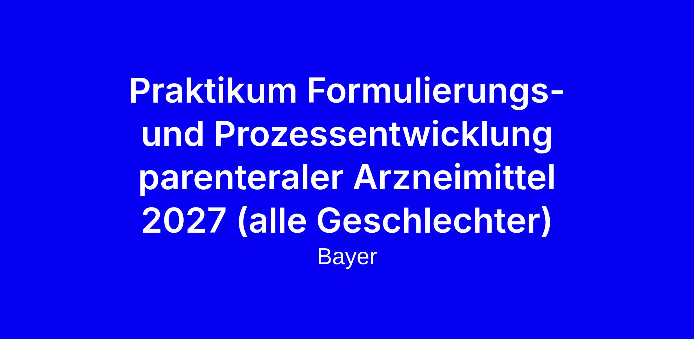 Das Praktikum Formulierungs- und Prozessentwicklung parenteraler Arzneimittel 2027 bei Bayer in Wuppertal richtet sich an Absolventinnen und Absolventen mit dem abgeschlossenen zweiten Staatsexamen im Studiengang Pharmazie und bietet bis zu sechs Monate praxisnahe Erfahrungen von der Formulierung bis zur industriellen Herstellung parenteraler Arzneiformen, einschließlich der Betreuung von Produkten und Prozessen von niedermolekularen Verbindungen bis Zell- und Gentherapie, Start im Mai oder November 2027. Du arbeitest eigenständig an Experimenten, wertest Daten aus, präsentierst Ergebnisse und planst eigene Projekte vom Labor bis zum Pilotmaßstab. Wesentliche Kriterien sind galenische und analytische Kenntnisse, gute Deutsch- und Englischkenntnisse, Teamgeist, Zuverlässigkeit und Eigeninitiative. Bewirb dich mit Lebenslauf, Anschreiben und Zeugnissen, betone relevante Laborerfahrungen und deine Motivation für Bayer, und nutze das PhiP-Netzwerk sowie Lernangebote.