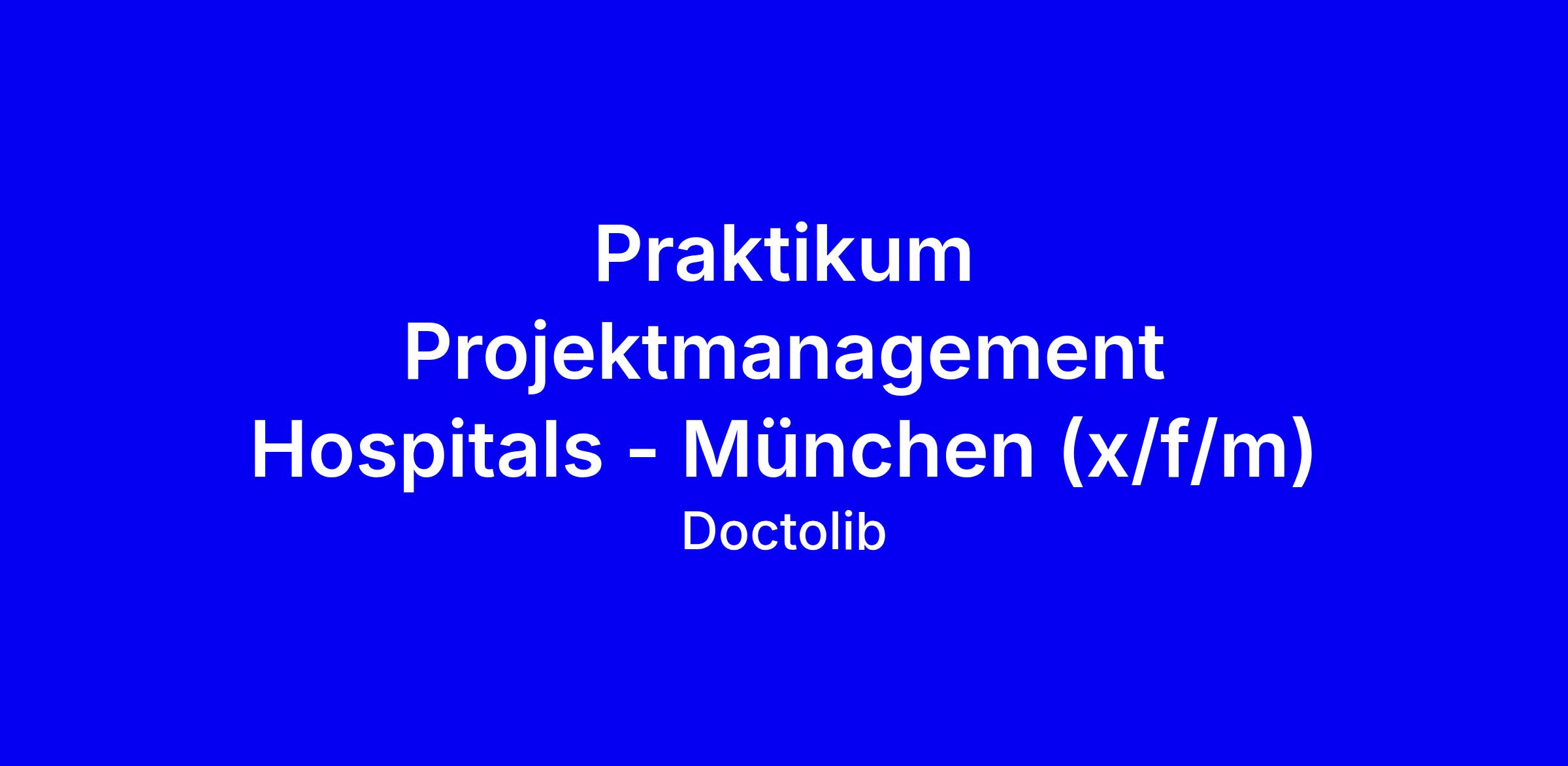Doctolib sucht ab April in München eine:n Praktikant:in im Bereich Projektmanagement für Krankenhäuser, 20 Stunden pro Woche, befristet auf ein Jahr, onsite. Du arbeitest im Hospital Deployment Team, unterstützt Neukundenschulungen, bereitest Implementierungsprozesse vor, dokumentierst Abläufe, nimmst Nachbereitungen vor und übernimmst eigene kleine Projekte. Du sammelst Einblicke in operatives und strategisches Projektmanagement, lernst Change Management im Gesundheitswesen, und stärkst deine Kommunikations- sowie Organisationsfähigkeiten mit Fokus auf Stakeholder-Bindung und Krankenhausabläufe. Gesucht werden Studierende im Gesundheitsmanagement oder mit gesundheitsbezogenem Background, Deutsch C2, Teamplayer mit technischer Affinität und Lernbereitschaft, idealerweise Excel/Sheets-Kenntnisse. Wir fördern Vielfalt und Diskriminierung wird nicht toleriert; bewirb dich auch mit konkreten Beispielen aus Studium oder Praxis, betone Teamarbeit, Lernbereitschaft und Flexibilität.