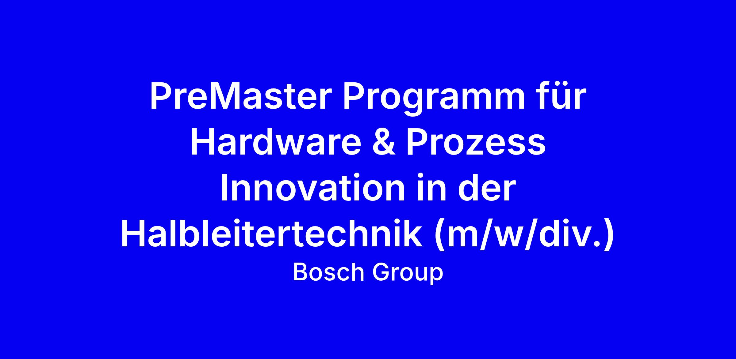 Das Bosch PreMaster Programm ist ein zweistufiges Qualifizierungsprogramm für engagierte Bachelor-Absolventinnen und -Absolventen, die das Ziel haben, ein Masterstudium zu absolvieren. Nach dem Bachelor bietet die erste Phase bis zu 12 Monate praktische Erfahrung im Rahmen eines Gap Years, um die fachlichen und unternehmerischen Zusammenhänge kennenzulernen. Die zweite Phase umfasst das Masterstudium und beinhaltet weitere praktische Einblicke im Rahmen studentischer Beschäftigungen sowie persönliches Mentoring auf dem Weg zum erfolgreichen Abschluss.