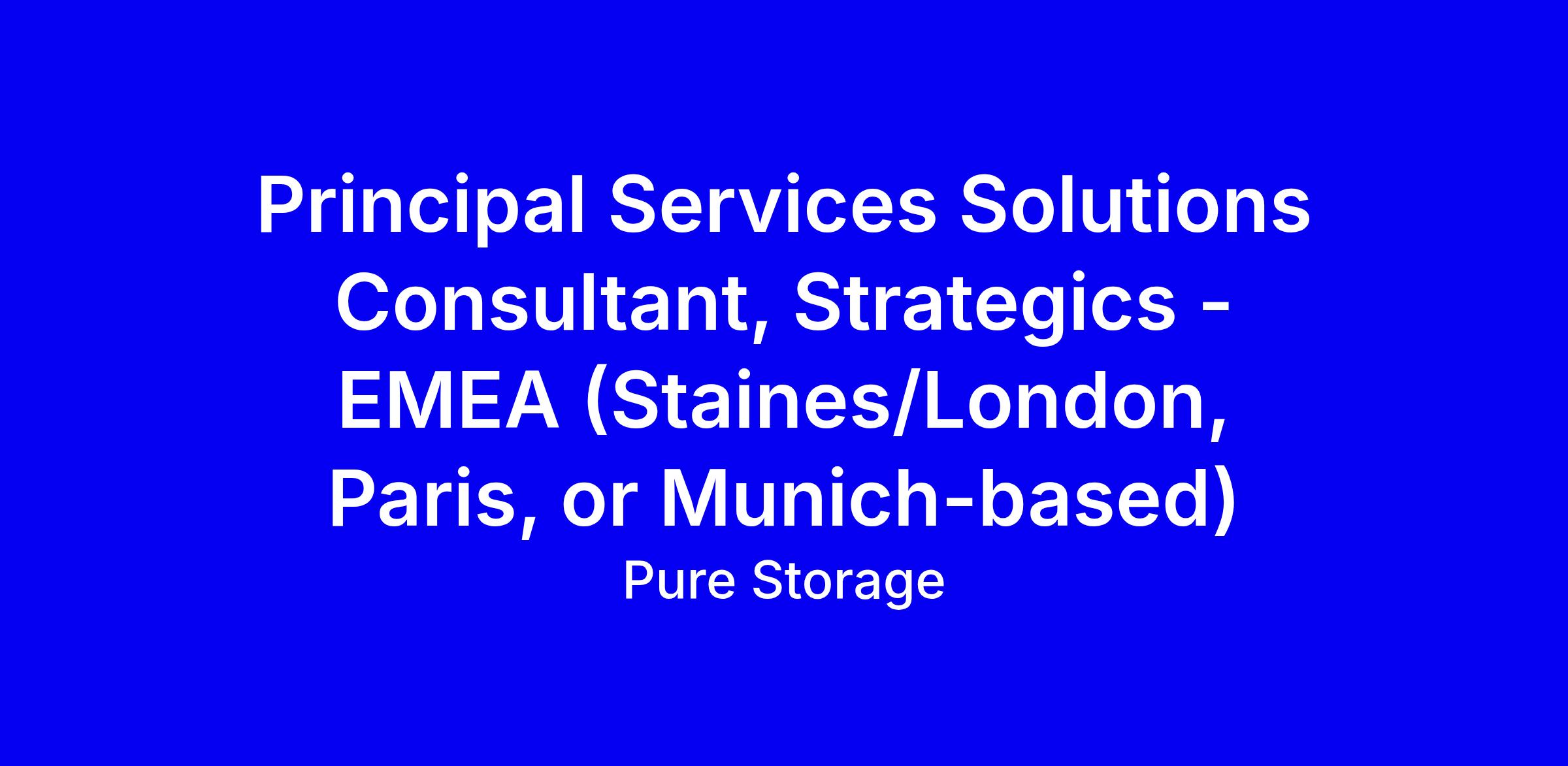 Pure Storage is seeking a Principal Services Solutions Consultant, Strategics for an exciting EMEA role based in Staines/London, Paris, or Munich. This full time onsite position partners with Sales, SE and Product to design and close large scale data management solutions, mentor colleagues, and drive new business across enterprise accounts. To excel you should bring 15+ years selling into verticals, 10+ years designing solutions across virtualization, storage, security and networking, and a proven ROI and value-based selling track record with RFIs and RFPs. Fluent English and a second European language are strongly desired, with up to 25% travel. Highlight measurable outcomes and cross-functional collaboration in your application.