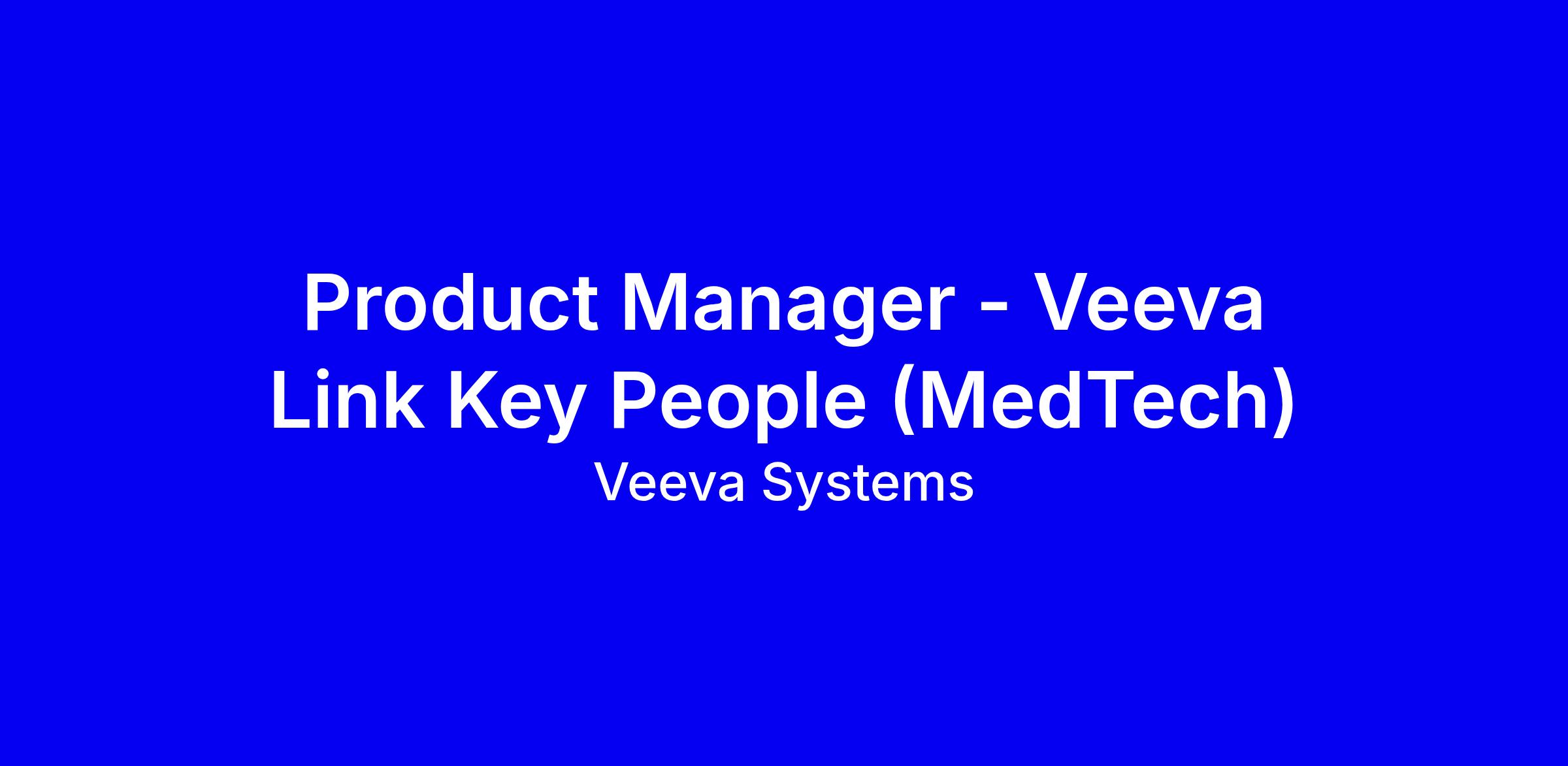 Veeva Systems is a mission-driven organization and pioneer in industry cloud, helping life sciences companies bring therapies to patients faster. As one of the fastest-growing SaaS companies in history, we surpassed $2B in revenue in our last fiscal year with extensive growth potential ahead.At the heart of Veeva are our values: Do the Right Thing, Customer Success, Employee Success, and Speed. We're not just any public company – we made history in 2021 by becoming a public benefit corporation (PBC), legally bound to balancing the interests of customers, employees, society, and investors.As a Work Anywhere company, we support your flexibility to work from home or in the office, so you can thrive in your ideal environment.Join us in transforming the life sciences industry, committed to making a positive impact on its customers, employees, and communities.The RoleOwn the success of Link Key People as our next Product Manager, with a focus on the MedTech industry. You will immerse yourself in our customers' workflows to translate their needs into scalable, data-driven solutions that deliver significant value and accelerate market adoption of Link Key People in MedTech.