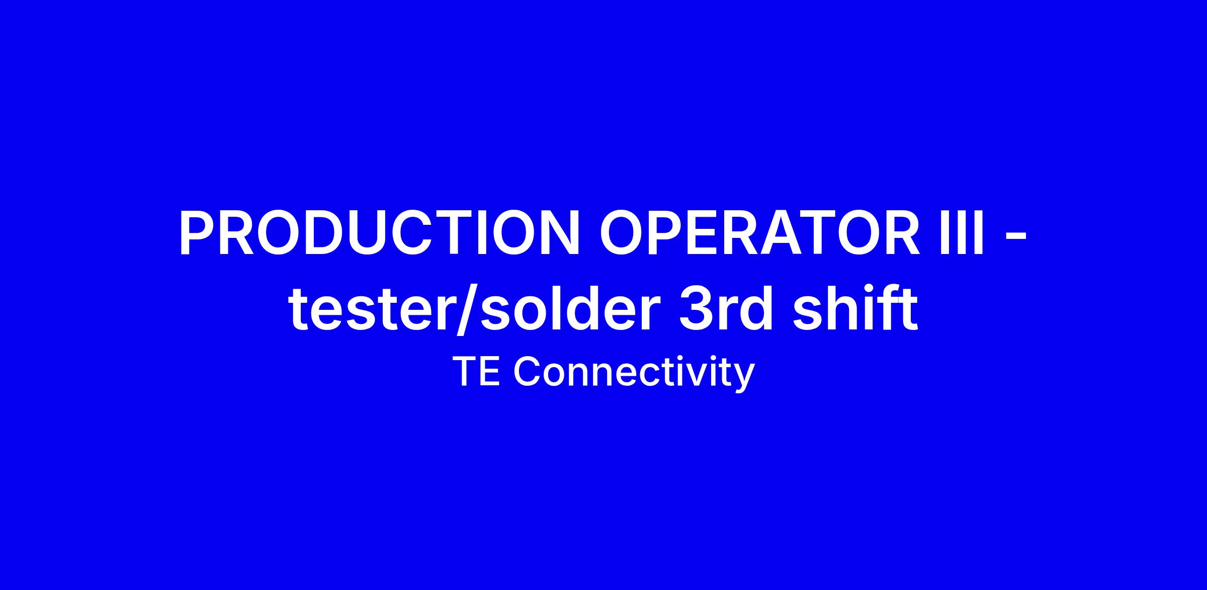 TE Connectivity is seeking a Production Operator III - tester/solder for a 3rd shift, full-time on site in Mansfield, OH. You will assemble, solder and test relays and contactors, conduct functional tests to FTP/ATP specs, and interpret blueprints and test instructions using a range of meters and tools. Potentially you may operate mass spectrometers or ESS equipment. Required: high school diploma or GED, ITAR eligibility, and the ability to read drawings. Certifications needed include ESD per OP 1707, Solder per OP 1701, Testing per OP 1704, and J-STD-001 IPC-620; if not certified, you must pass tester certification on first attempt. Emphasize teamwork and problem solving; be prepared to train others. Competitive pay and benefits.