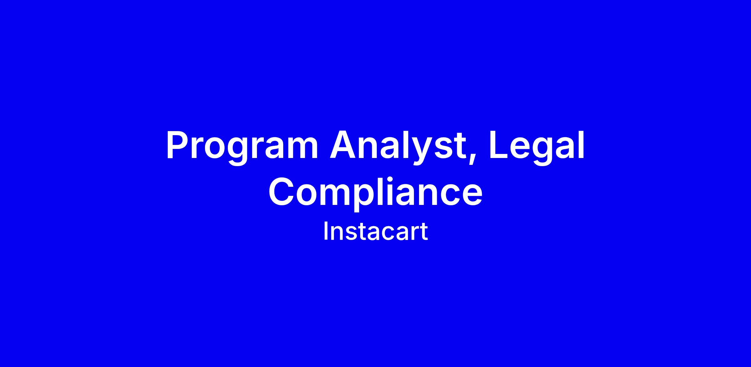 Instacart is hiring a Program Analyst, Legal Compliance Program to support the Legal Risk and Compliance function and the systems and workflows that enable the compliance program to be visible, efficient and effective. You will focus on process execution, data analyst, tooling implementation and support, reporting, documentation, and workflow upkeep across the Risk and Compliance teams.