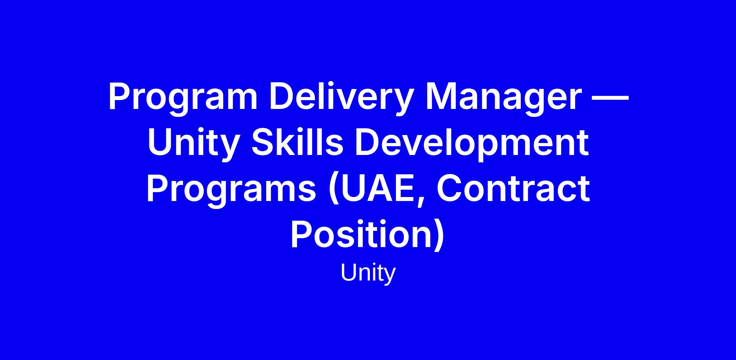Unity is seeking a Contract Program Delivery Manager for Skills Development Programs in the UAE, based in Abu Dhabi, to lead regional delivery and coordinate with global teams. The role sits in the Customer Success organisation and partners with government, universities and industry to adapt global program frameworks to local priorities, manage governance, timelines, risks and KPIs, and ensure high quality outcomes aligned with national skilling agendas. The ideal candidate has proven experience delivering large scale training with public-sector partners, strong operations and stakeholder management skills, fluency in Arabic and English, and familiarity with ME public sector initiatives; experience with real time 3D or Unity products is a plus. To apply, tailor your CV to highlight regional program delivery, quantify impact, demonstrate multi-stakeholder collaboration, and address relocation constraints early.