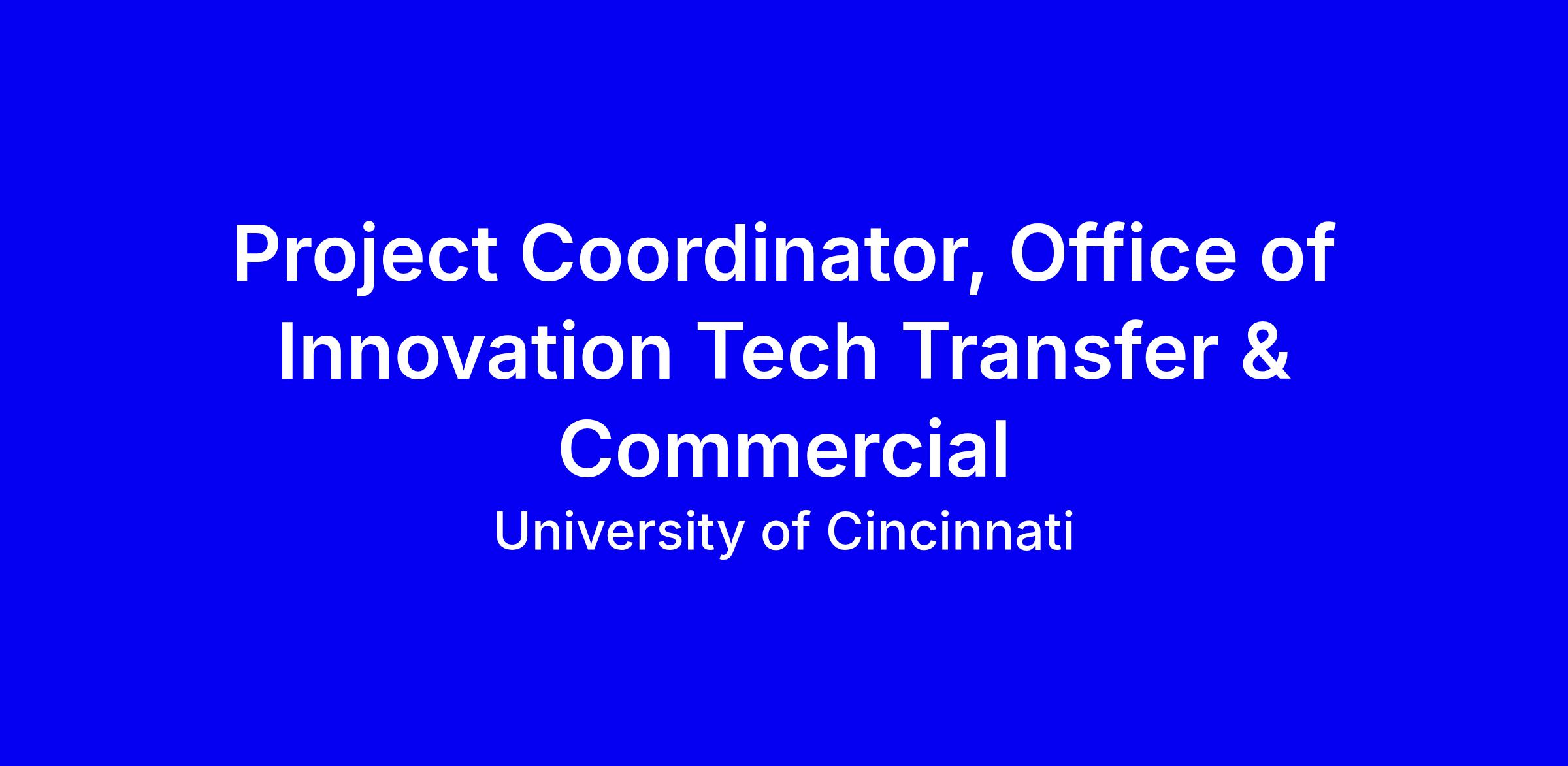 University of Cincinnati is seeking a Project Coordinator for the Office of Innovation Tech Transfer & Commercial. This full-time onsite role supports the Commercialization Navigator in identifying, developing and advancing UC innovations toward transfer and commercialization, while coordinating with inventors and external partners. You will organize meetings, maintain timelines, collect data, draft reports and non-confidential summaries, and monitor progress toward objectives. Requirements: Bachelor’s degree and one year of relevant project coordination experience, with five years substituting for education. Compensation up to $65,000 plus UC benefits, tuition remission, strong retirement options, and excellent work-life balance. Apply through the UC applicant portal; internal candidates must use SuccessFactors.