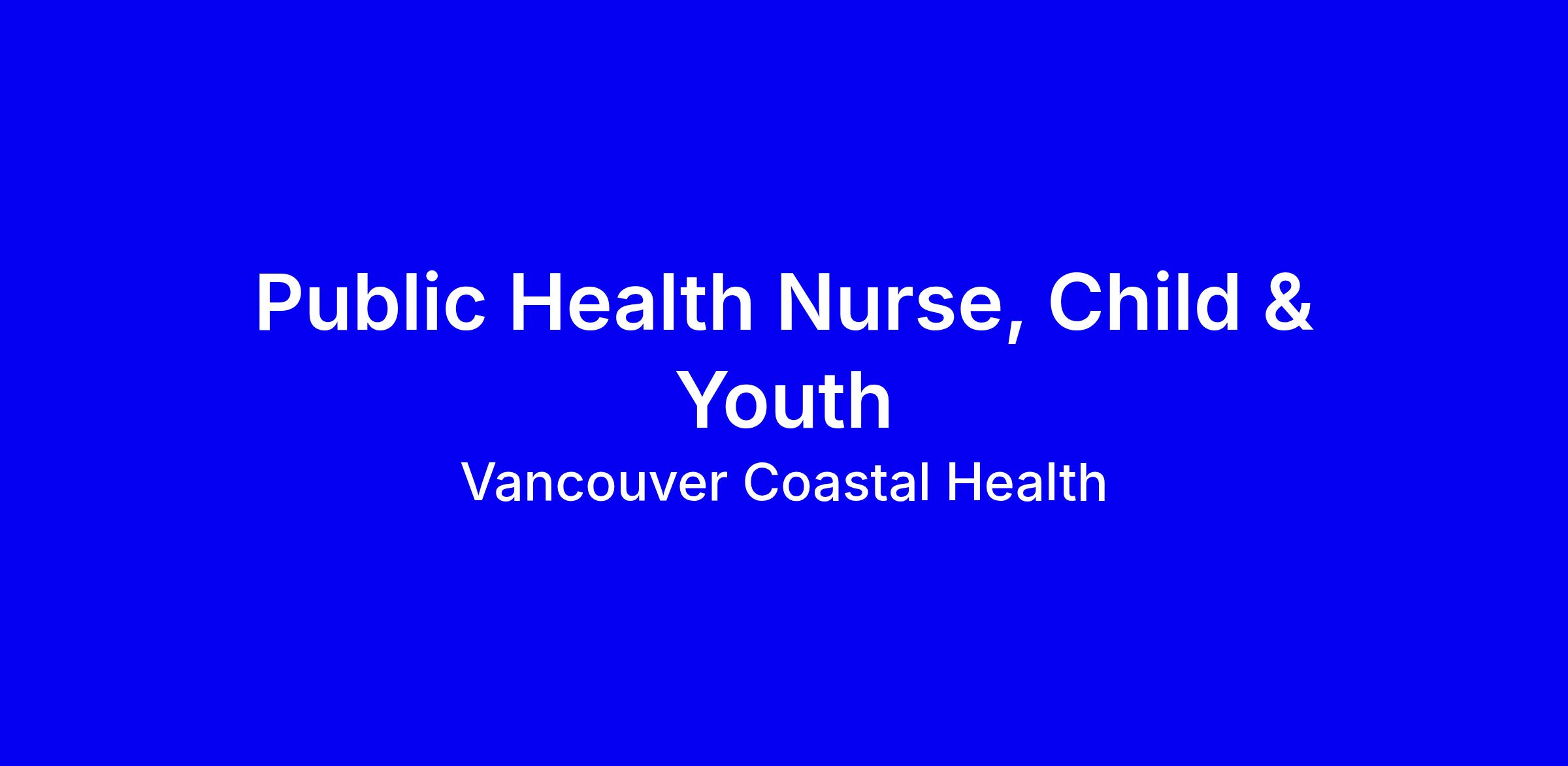 JOB SUMMARY:Utilizes public health nursing knowledge and expertise to promote and protect the optimal health, well-being and safety of the designated client population with a focus on services for children and youth between the ages of 5-24 years and their families. Provides a full continuum of services including prevention, health promotion and early intervention services to individuals/groups in a variety of community-based settings using an equity based approach to support the population health and mitigate the impacts of the social determinants of health with equity deserving populations Establishes and maintains interdisciplinary and community relationships with internal and external partners. Identifies the client as individual/community/system and determines necessary interventions using a continuum of public health nursing interventions such as screening, assessment, referral, advocacy, surveillance and monitoring, education, consultation and responding to public health emerging issues. Practices within the context of a client and family centered care model, and in accordance with the British Columbia College of Nurses and Midwives (BCCNM) standards of practice and Code of Ethics for registered nurses, the Canadian Community Health Nursing Standards of Practice and the CHNC Public Health Nursing Discipline specific competencies and the scope of practice as set by the organization’s policies, guidelines and clinical practice documents and within own competence. Practice is aligned with the vision, mission, goals and values of the organization as well as within the context of a public health care approach and the concept of a client and family centered care model.