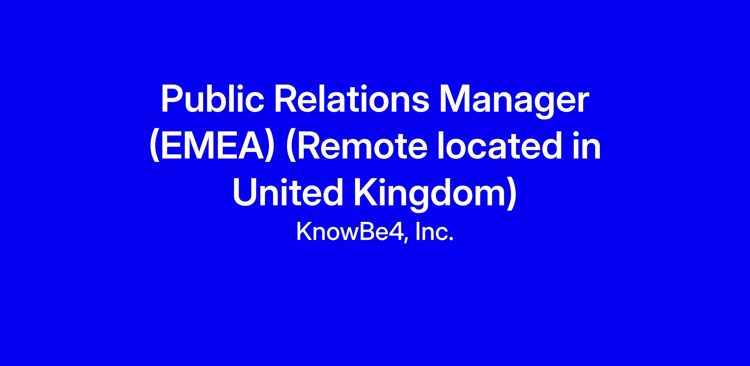 KnowBe4 is seeking an EMEA Public Relations Manager to drive regional PR strategy from the United Kingdom, with hybrid options in Leeds and remote work across the UK, aligning with our global program. You’ll manage PR agencies across the EMEA region, lead campaigns and media outreach, and localize content for markets including the UK, Germany, the Netherlands, South Africa, the Nordics and France. Requirements include 5+ years in PR, tech or cybersecurity experience preferred, agency management, superb writing and communications, and the ability to respond quickly to media opportunities; multilingualism is a plus. To apply, tailor your resume to show regional campaigns with measurable results, include a concise case study, and highlight alignment with KnowBe4 values and readiness for assessment and background check.