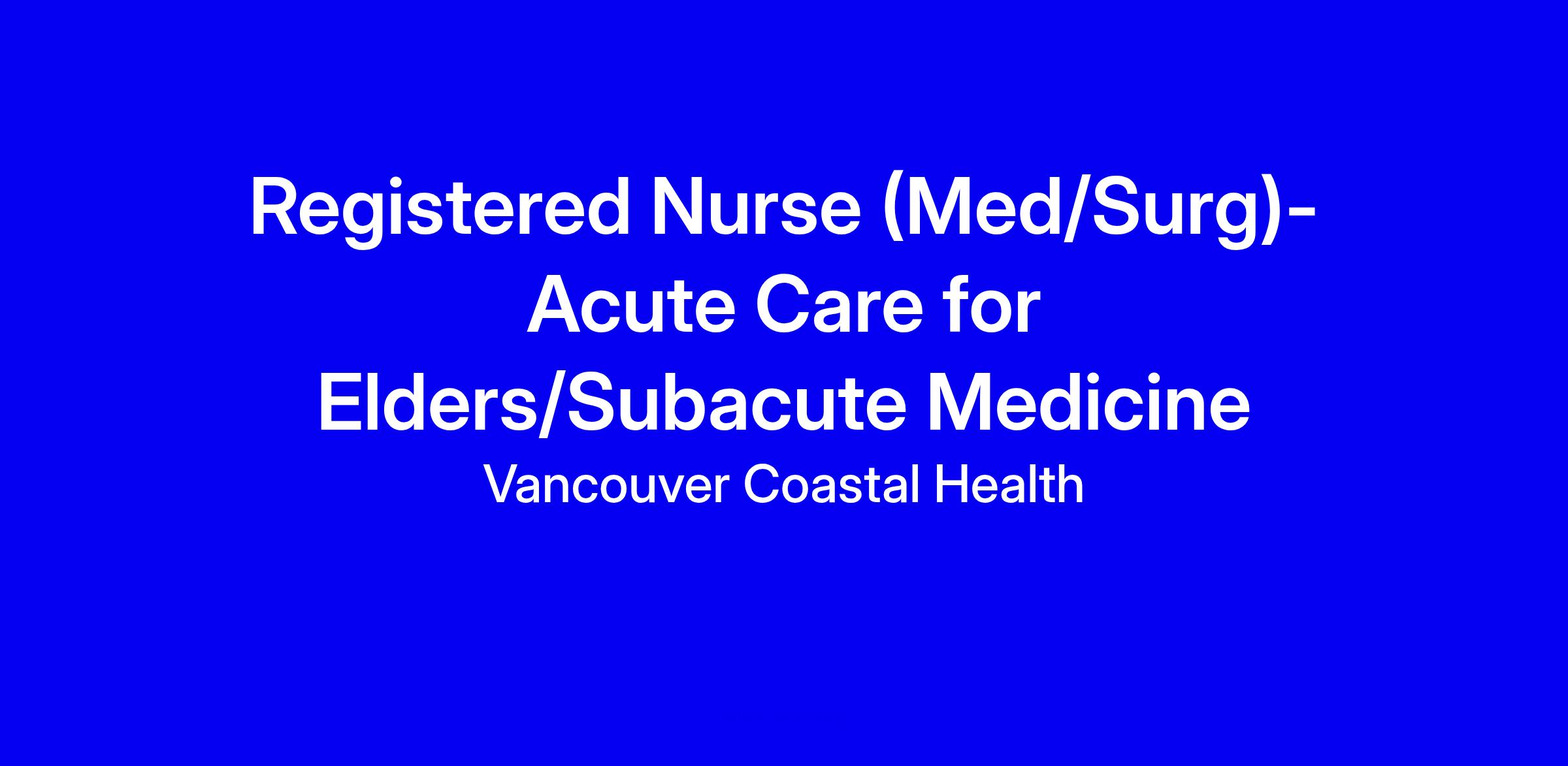 Vancouver Coastal Health seeks a temporary Registered Nurse for Med/Surg, Acute Care for Elders/Subacute Medicine, onsite in Richmond. This internal posting accepts late applications. The role blends independent practice with interdisciplinary teamwork, focusing on assessment, planning, implementation and evaluation of care for older adults with acute and subacute conditions, discharge planning and patient advocacy. You will document in standard systems, manage oxygen therapy, IVs and wound care, and support pain and delirium management while serving on committees. Requirements include BCCNM registration, geriatric knowledge, and the ability to anticipate complications. Tips: tailor your resume to geriatric/subacute care, highlight collaboration and Omnicell/MAR, align with VCH values. Note Article 17.02 (c) NBA; hours may change; apply via Internal Career Portal; late internal applicants reviewed after on-time candidates.