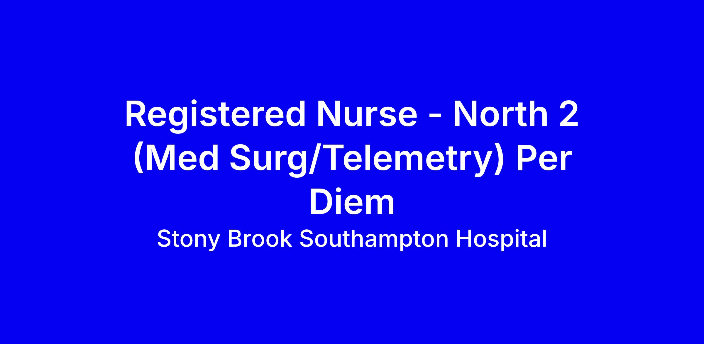 Stony Brook Southampton Hospital is hiring a Registered Nurse for North 2 Med Surg/Telemetry on a Per Diem basis. In this Team Leader role you’ll plan, coordinate, and supervise nursing care, develop individualized care plans, educate patients and families, and uphold safety and policy standards. Daily duties include patient assessment, direct care, medication administration, infection control, discharge planning, and clear communication with the Charge RN and other departments, plus contributing to unit QA activities. Requirements: RN from an approved school, New York State license, BLS and PALS; ACLS within 3 months of hire (new grads within 6 months). Resume/CV required with online application; salary around $65.63/hour; shifts are variable, onsite in Southampton.