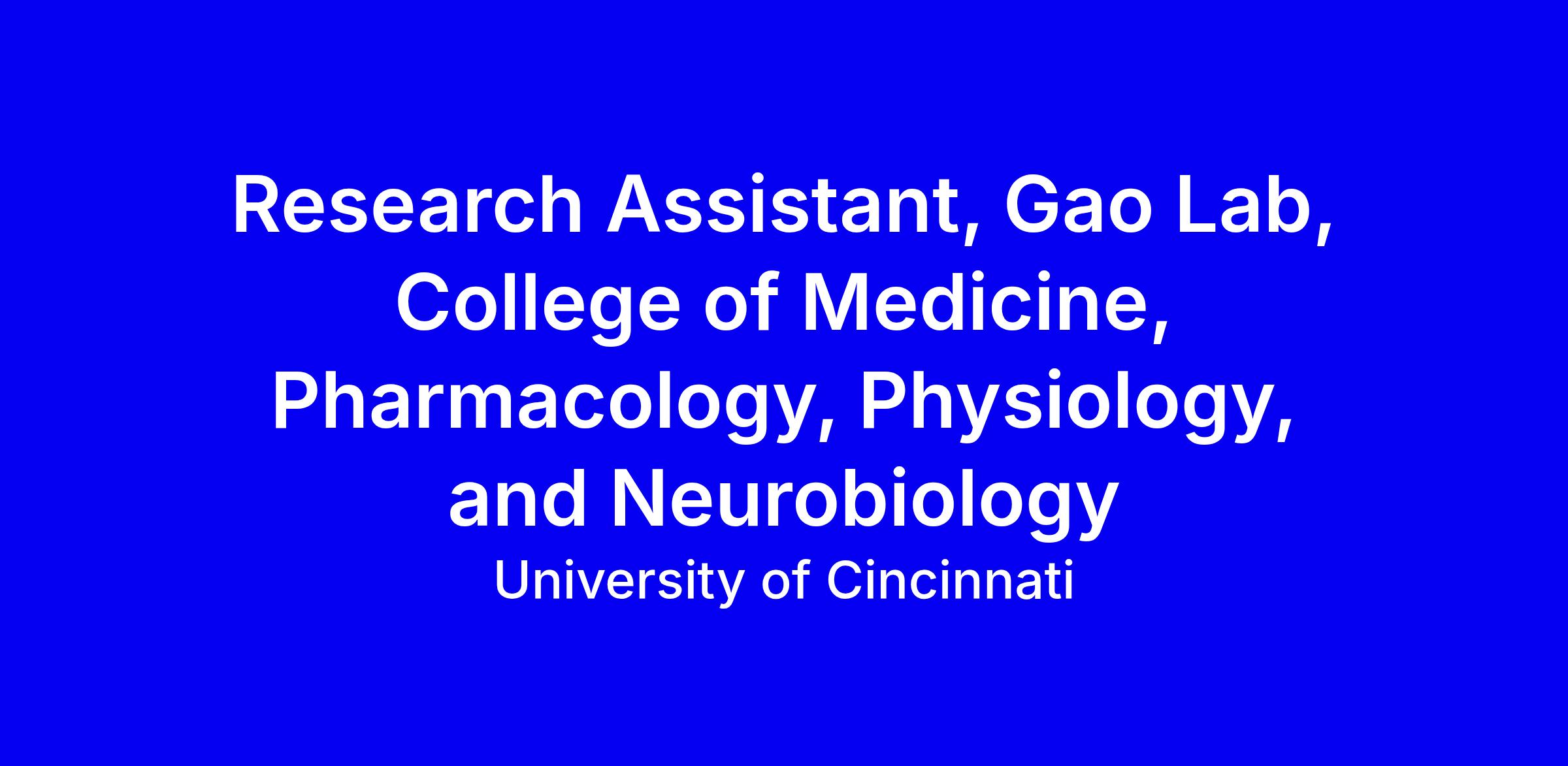 The laboratory of Dr. Chen Gao in the Department of Pharmacology, Physiology, and Neurobiology, College of Medicine at the University of Cincinnati, is looking for a motivated Research Assistant to assist with the coordination of laboratory projects or research studies in a particular discipline, makes independent contributions to projects and studies based on professional training or functional experience.