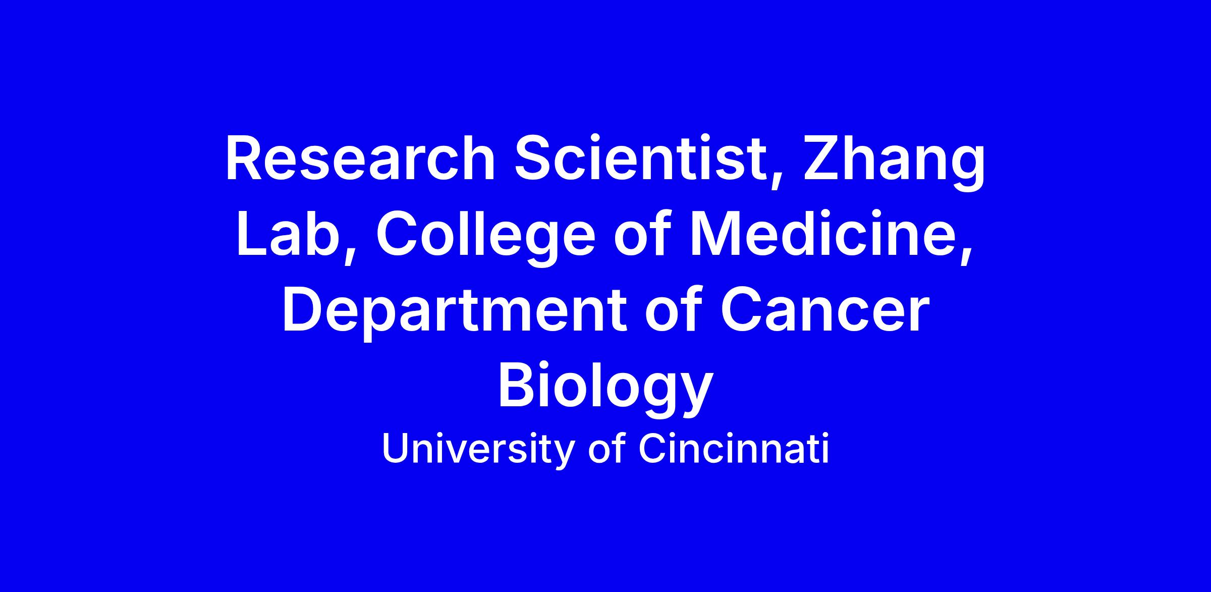 University of Cincinnati is seeking a Research Scientist in Dr. Xiaoting Zhang’s lab (College of Medicine, Department of Cancer Biology) to study transcriptional and epigenetic gene regulation in breast cancer metastasis and therapeutic resistance. The project combines biochemical, molecular, genomic, and mouse genetics approaches and includes developing RNA-based nano-therapeutics. Daily work includes independently designing experiments, helping write proposals and grants, drafting manuscripts, and pursuing professional development. Requirements include a PhD in Biomedical Science, Clinical & Translational Science, or related field. This full-time, onsite position offers UC’s comprehensive benefits and a salary around $62,000, along with strong retirement options and tuition remission. Internal UC applicants must apply via SuccessFactors.