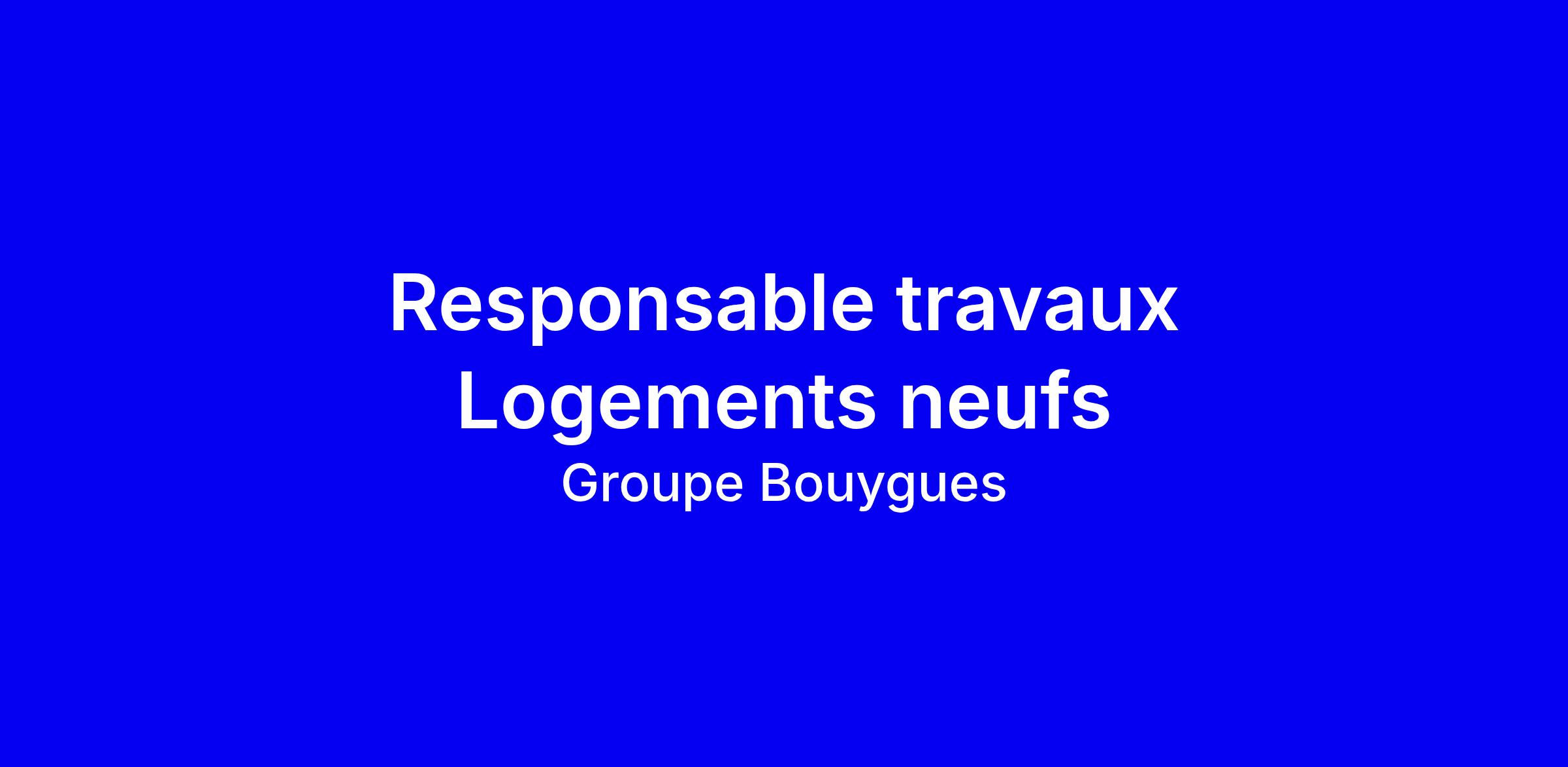 Responsable travaux Logements neufs pour Habitat Social chez Bouygues Construction, vous prenez les rênes d une opération de 74 logements à La Courneuve (93) en tant que délégataire de pouvoirs, vous supervisez le chantier du GO aux corps d états secondaires jusqu à la livraison et garantissez la qualité, le planning et les résultats financiers avec un reporting régulier. Vous êtes l interlocuteur privilégié du client et des partenaires, vous animez les réunions et optimisez l aspect financier tout en travaillant avec les services supports du chantier dans le cadre sécurité et Sûreté. Profil: expérience confirmée en conduite de travaux neufs dans un grand groupe ou PME, sens relationnel, rigueur et capacité d anticipation. Avantages: formation, rémunération attractive et épargne salariale, mobilité interne possible. Pour toute question, contactez Julie COUSIN [email protected]
