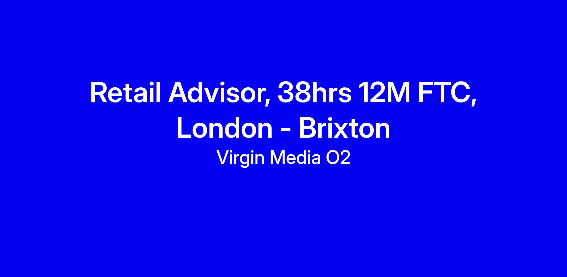 Virgin Media O2 is hiring a Retail Advisor in Brixton for 38 hours a week on a 12 month FTC, onsite in London. You’ll welcome customers, build rapport, tailor product recommendations, showcase innovations, and help keep a welcoming store. Must haves include strong communication, confidence, resilience and flexibility, plus a curious tech minded mindset and team spirit. Prior retail experience helps but isn’t required. The role includes a 4 day induction, a competitive £12.40 hourly rate with accreditation upsides, BUPA medical cover, generous leave and a strong pension. To apply, tailor your CV to show service impact, learning mindset and teamwork; complete the online assessment and discuss targets and collaboration.