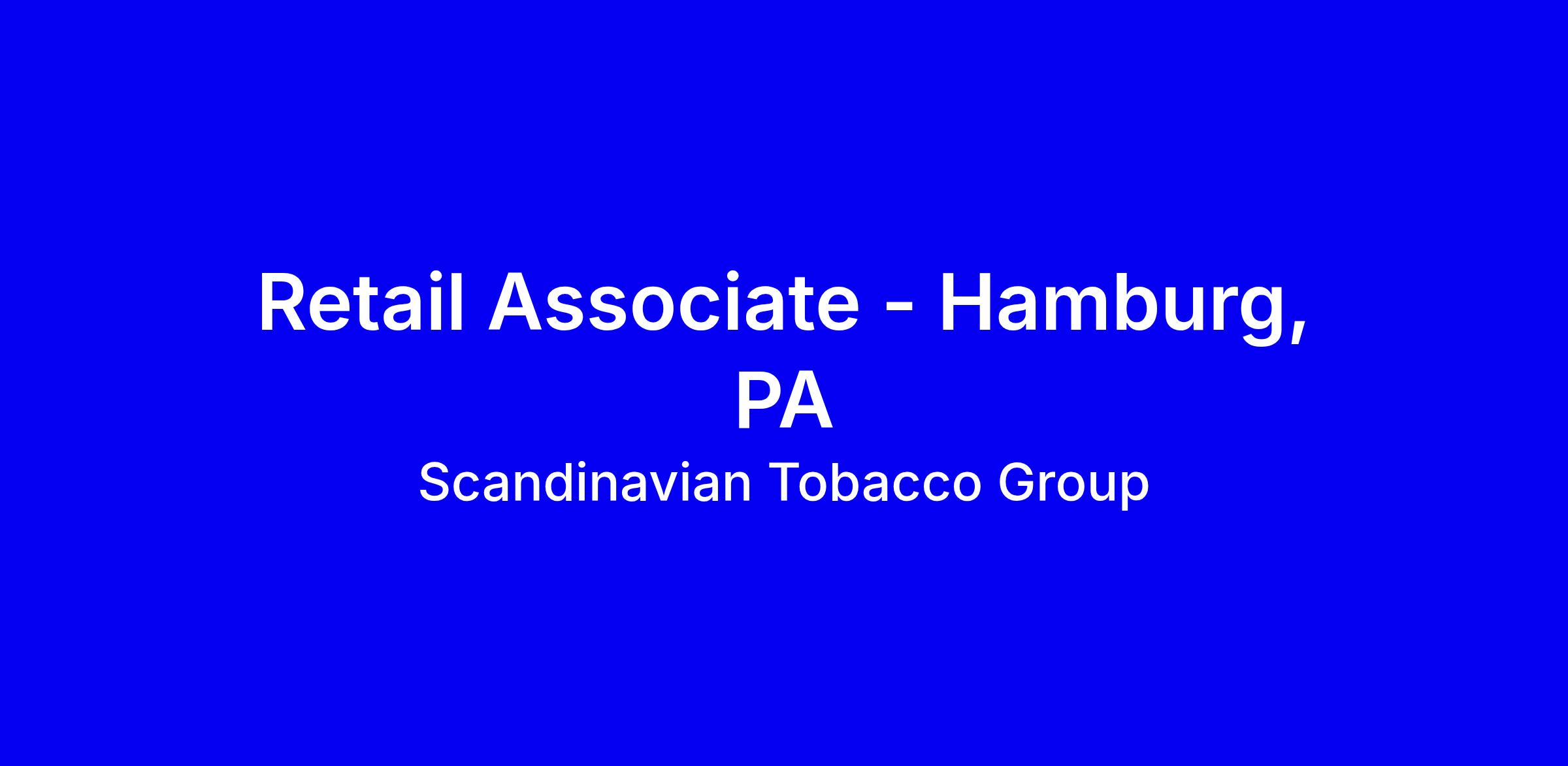 Scandinavian Tobacco Group is hiring Retail and Bar Associates for full-time and part-time roles in the Hamburg area, onsite in Bridgeville, PA. Open to experienced or entry-level candidates, these roles focus on delivering a standout customer experience through sales, merchandising, in-store events and operations, with an emphasis on engaging customers. You will work in a cigar friendly environment, restock shelves, climb ladders and operate a POS system, and you must be able to work flexible shifts. The ideal candidate is people oriented, an independent thinker with strong attention to detail and the ability to connect with customers. Benefits include health coverage, 401(k) with company match, PTO and holidays. E-Verify is used.