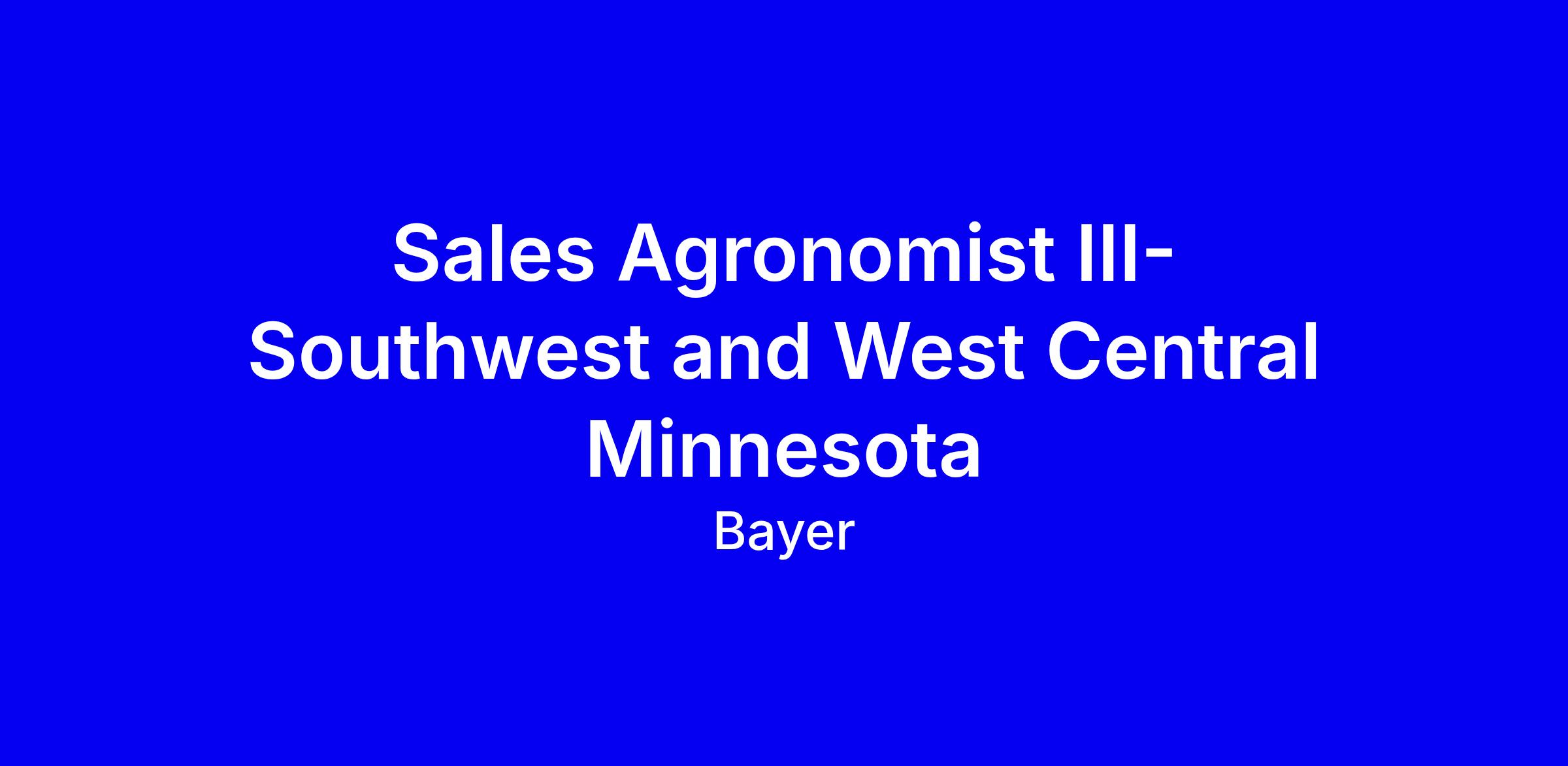 Bayer is hiring multiple Sales Agronomist III for Southwest and West Central Minnesota in a full-time remote role. You’ll be the local agronomic expert, building a portfolio for about 100 growers, nurturing relationships, driving demand generation, and guiding whole-farm decisions from planning to harvest while coordinating trials and seasonal milestones. Expect roughly 60 percent travel and collaboration with Field Sales Reps, TAs, and SeedPros. Ideal candidates bring agile communication, strategic thinking, data-driven decisions, digital fluency, and proven sales ability; preferred 8+ years and a bachelor’s degree. Tips: tailor your resume to show portfolio wins, budget stewardship, and successful trials; highlight remote teamwork. Salary $90,640 to $135,960 plus incentives; Bayer is an equal opportunity employer.
