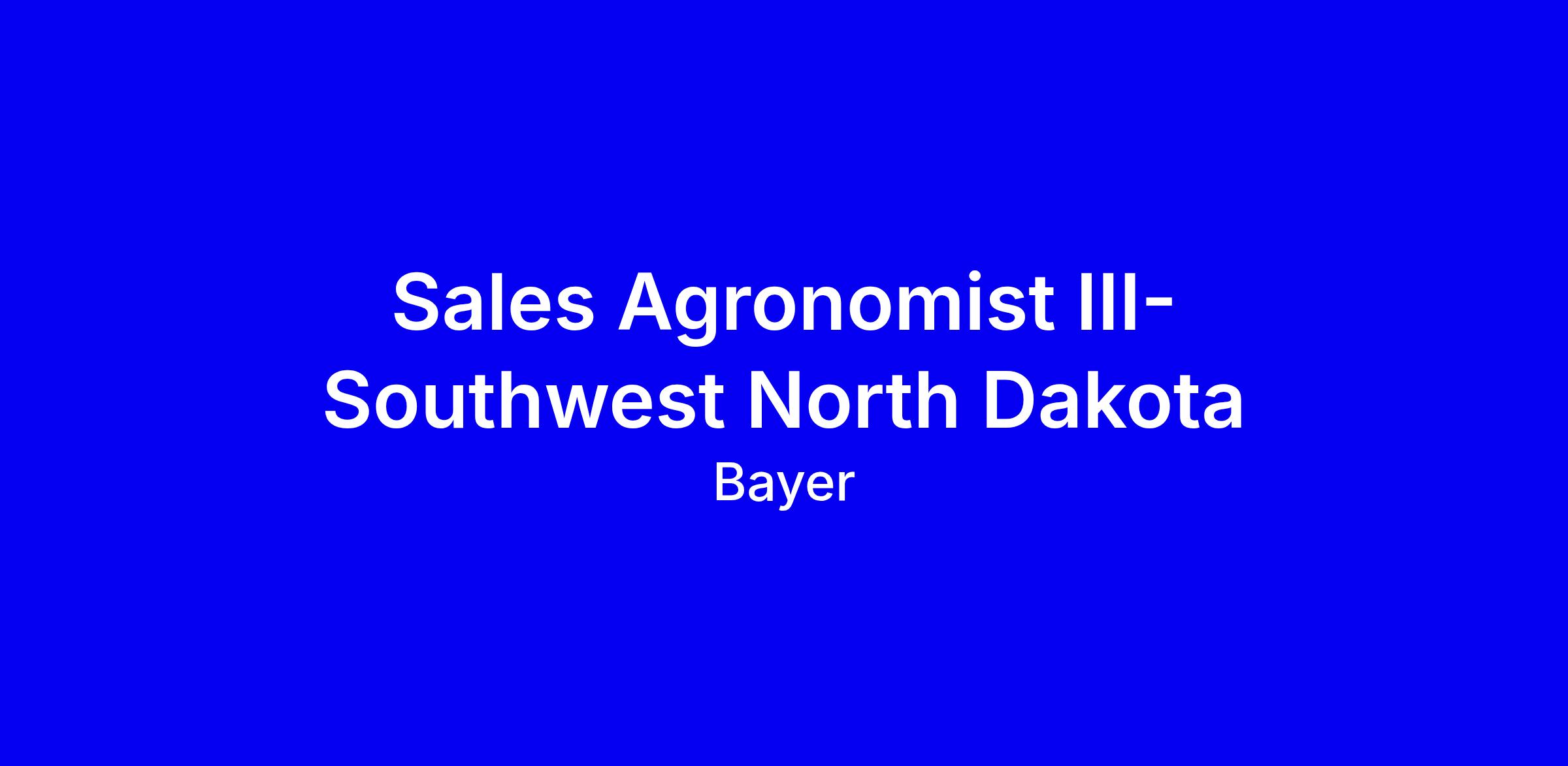 Bayer seeks a Sales Agronomist III for Southwest North Dakota, a residence-based, full-time role with roughly 60% travel, serving as the local agronomic expert who builds relationships with about 100 growers and leads portfolio plans with Field Sales Representatives. You will provide whole-farm agronomic guidance, drive Bayer portfolio trials, support seasonal milestones, and collaborate with FSRs, TAs and partners while managing an annual SG&A budget. Required are agile, relationship-driven communication, strategic and data-driven thinking, digital fluency, strong sales and negotiation skills, and the ability to learn agronomy quickly and drive results. Preferred: 8+ years in agronomy, sales, or marketing; bachelor’s in agriculture or related field. Apply by Feb 6, 2026; Bayer is an Equal Opportunity Employer.