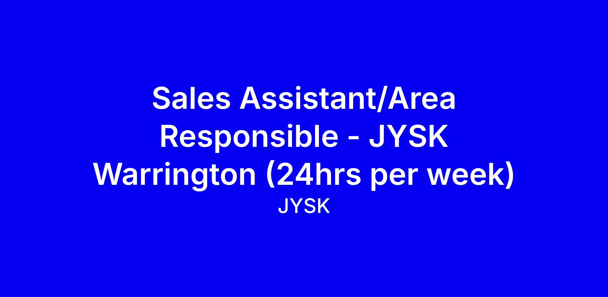 JYSK Warrington is hiring a Sales Assistant/Area Responsible for 24 hours a week with potential overtime; the role centers on delivering top customer service, keeping a clean, well stocked store, assisting with receiving goods, and stepping into area responsibility as needed. JYSK highlights internal development, a dynamic culture, and rewards such as a lucrative sales bonus, 20% staff discount, and a Christmas closure. The role pays £12.55 per hour and requires one weekend day. The ideal candidate is outgoing, proactive, and enjoys talking to customers, with a collaborative mindset and flexible hours including weekends. To apply tailor your CV to sales wins and teamwork, and prepare for interviews and a video assessment; contact [email protected] for guidance.