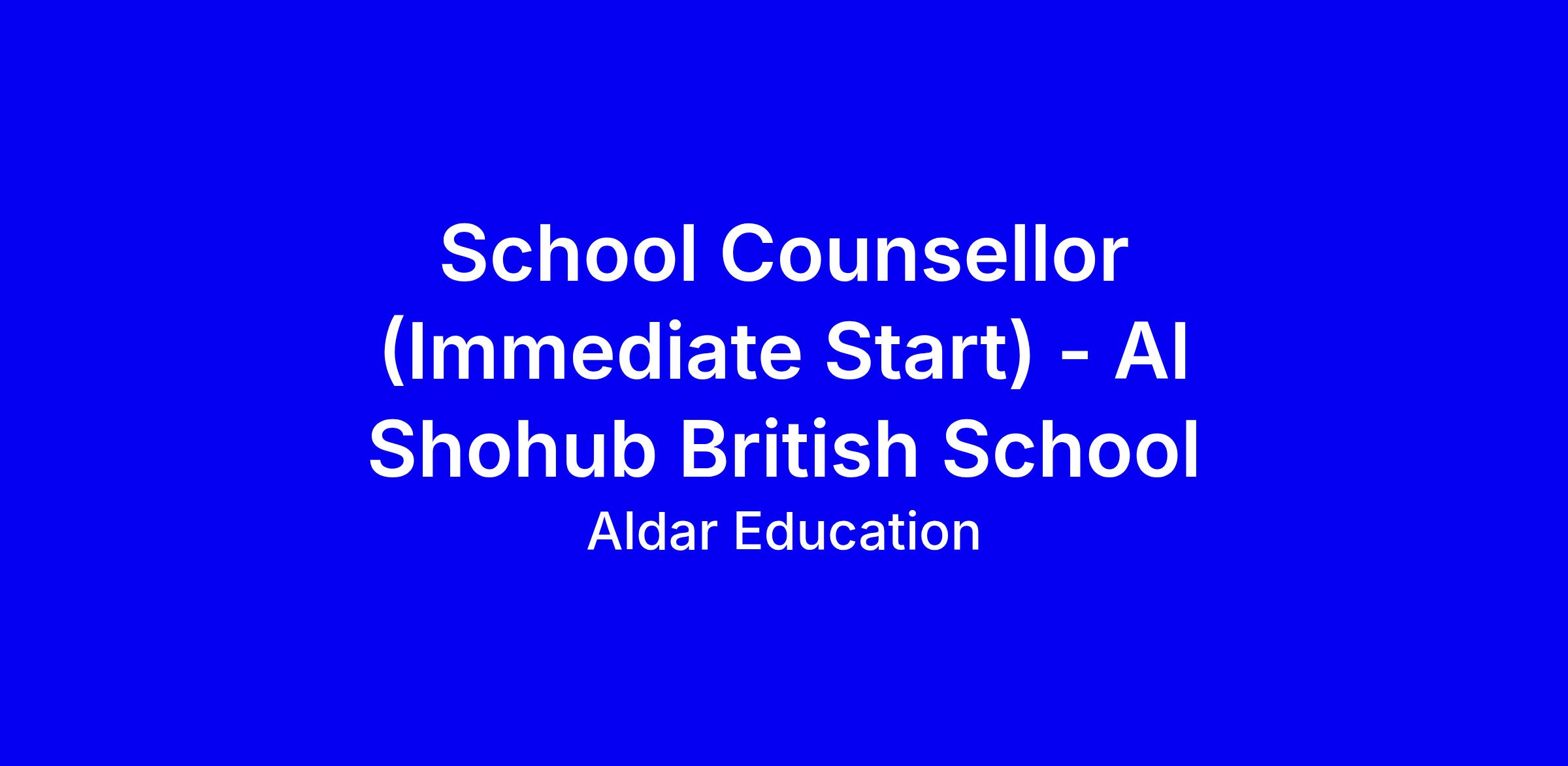 Aldar Education are currently seeking a School Counsellor (Immediate Start) for Al Shohub Private School to support our growing family of owned and operated schools in the UAE.