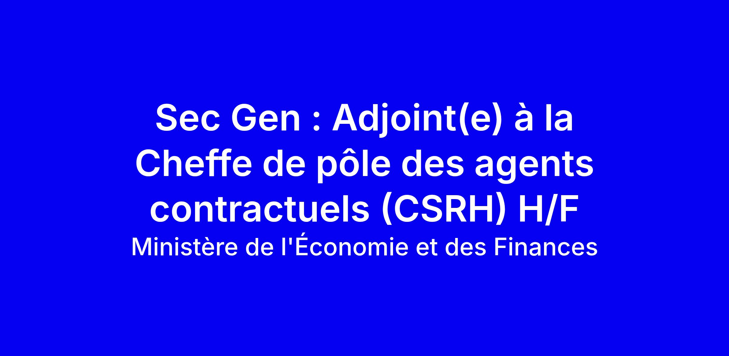 Cette offre du Ministère de l Économie et des Finances vise à pourvoir le poste de Sec Gen Adjoint(e) à la Cheffe de pôle des agents contractuels (CSRH) H/F, cadre A, en contrat à temps plein et sur site à Paris. Placé sous l’autorité du chef de pôle, l’adjoint assure l’appui au pilotage, la planification des travaux, l’expertise et le conseil juridique, la signature des actes de gestion, le soutien aux projets et la liaison avec les partenaires internes et externes, ainsi que la gestion administrative et la préliquidation de la paie des agents contractuels. Profil requis: expérience RH, maîtrise du droit et des règles de paie, rigueur, sens organisationnel, esprit d’équipe et capacités managériales. Télétravail possible, formation à la prise de poste possible. Postulez sur PASSERELLES avant le 23 mars 2026 en joignant CV, lettre de motivation et les 3 derniers CREP; début prévu le 1er avril 2026, lieu Paris 12e.