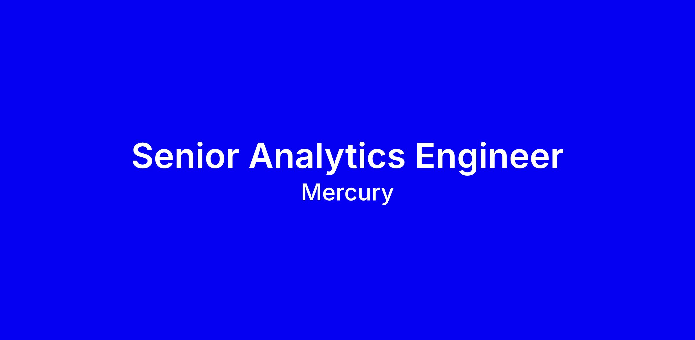 We’re hiring a Senior Analytics Engineer to help build the data foundation that accelerates Mercury’s transition to an AI-native analytics platform. You’ll join a team of high-performing Data and Analytics Engineers building the shared foundations that power decisioning, automation, and measurement across the company, collaborating closely with Data Scientists and partners in Product, Engineering, and Operations. Your curiosity and bias toward action will drive meaningful impact as you build durable data products, unlock faster experimentation, and help teams ship things like propensity models and agentic workflows. Come grow with us.