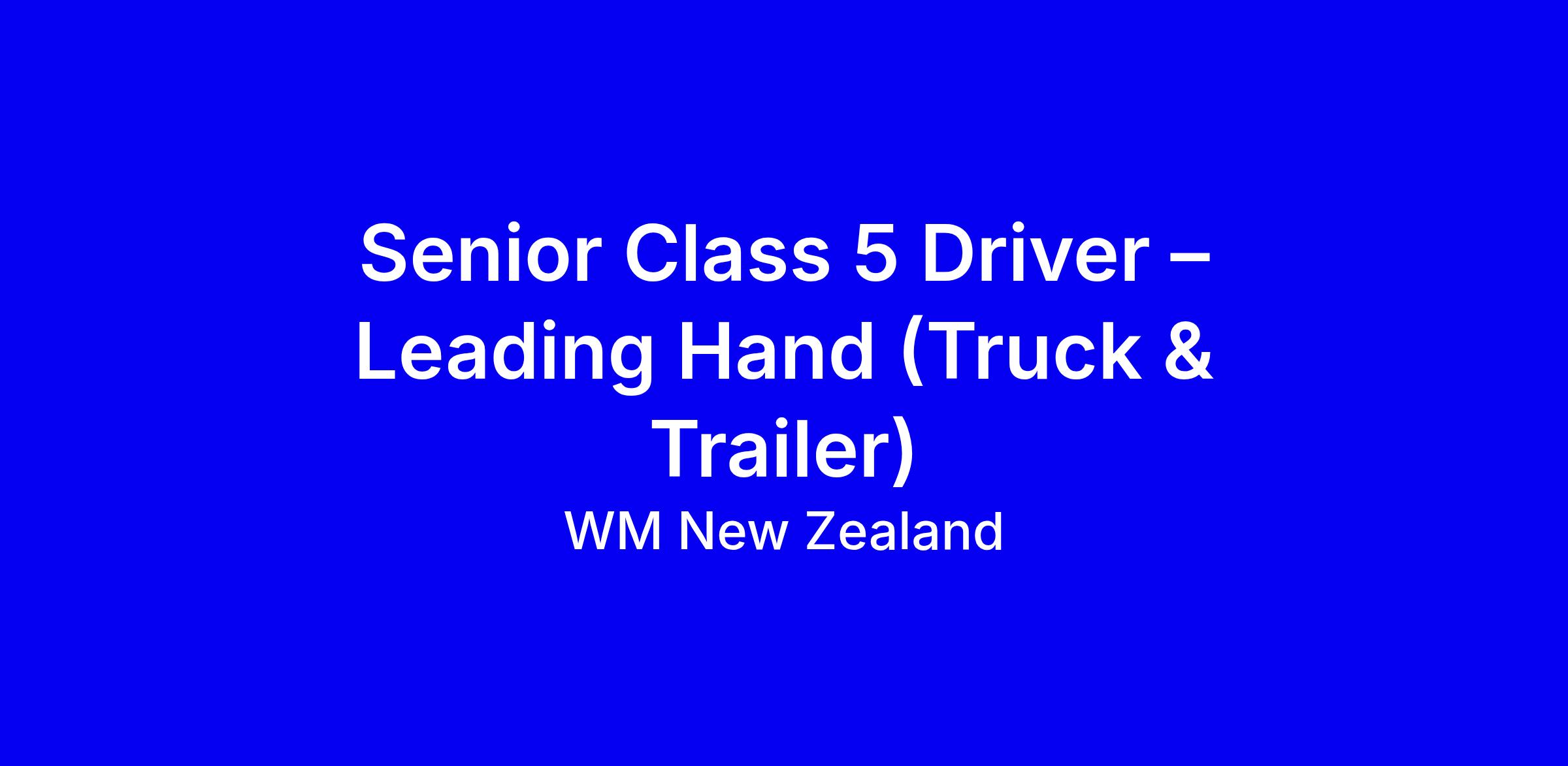 WM New Zealand is seeking a Senior Class 5 Driver Leading Hand in Christchurch for full time onsite work within its Technical Services division. The role travels across the South Island 3 to 4 days a week, operating Class 5 truck and trailer units to collect and transport hazardous waste while mentoring a driver team and upholding safety and accurate paperwork. Key requirements include a full Class 5 licence with proven truck and trailer experience, a DG endorsement or ability to obtain, strong knowledge of South Island routes, and a hands on leadership mindset; vacuum truck experience is a plus. Apply with a CV that highlights leadership in field operations, safety performance, and multi day travel, and confirm NZ work eligibility. Early applications encouraged.
