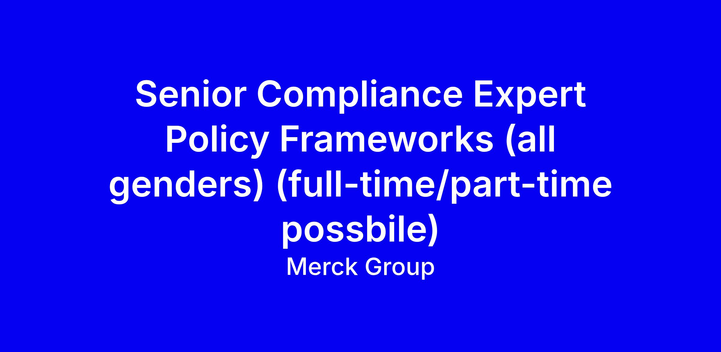 Merck Group seeks a Senior Compliance Expert Policies & Trainings to lead policy within the CoE Compliance, reporting to the Director Compliance and AML Lead. Onsite Darmstadt role owns the policy, designs training, and operationalizes it through tools and processes with teams. Core duties include policy reviews, drafting policies, creating training, ensuring consistent interpretation, driving awareness and supporting AML activities. The ideal candidate has 6 years in Legal & Compliance, strong project management and analytics, English fluent with German a plus. In your application, highlight policy simplifications, CMS improvements, and training outcomes, demonstrate cross functional impact and ownership; confirm willingness to be onsite and open to part time if needed. Apply now to join a diverse team.