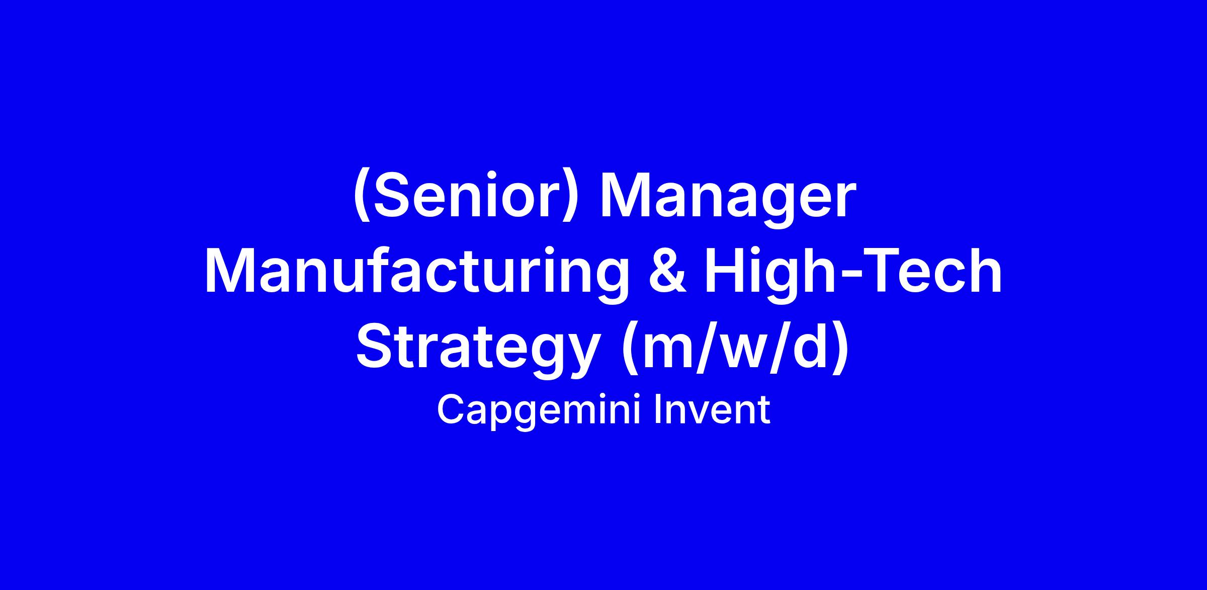 Capgemini Invent sucht einen erfahrenen (Senior) Manager Manufacturing & High Tech Strategy (m/w/d) in Berlin, der internationale Strategien leitet, Teams führt und Executive-Kunden in digitalen Innovations- und Transformationsprojekten begleitet. Sie arbeiten an Smart Products, Connected Value Chain, Sustainability, RPA, AI-Strategien und digitalen Plattformen, treiben Effizienzsteigerung und Large-Scale-Transformationen voran und bauen globale Top-Management-Beziehungen auf. Gesucht wird eine Persönlichkeit mit Hochschulabschluss, mehrjähriger Führungsverantwortung im Beratungsumfeld oder in internationalen Unternehmen, starkem IT-Verständnis, agiler, eigenverantwortlicher Arbeitsweise sowie Deutsch und Englisch auf hohem Niveau und Reisebereitschaft. Wir bieten ein internationales Umfeld, klare Karriereperspektiven, individuelle Entwicklung, Vielfalt und attraktive Benefits. Bewerbungen erfolgen über unser Portal unter Angabe der Gehaltsvorstellung, des frühestmöglichen Eintrittsdatums und der Standortpräferenz; bei Fragen an [email protected].