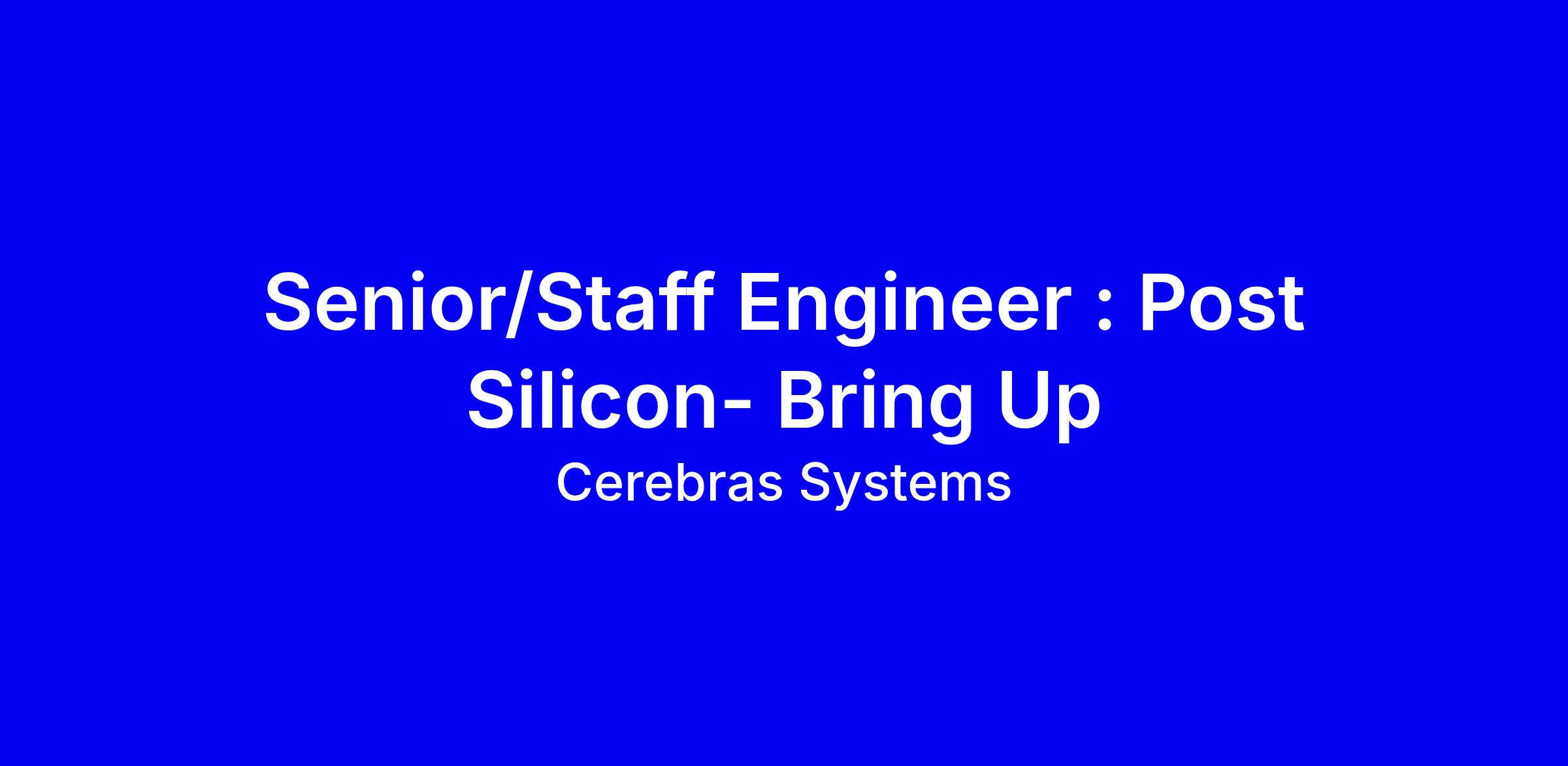 Senior/Staff Engineer Post Silicon Bring Up at Cerebras Systems is a hands on role to own bring up and optimizations of the Wafer Scale Engine, working with chip design, performance, software and productization teams. You will develop end-to-end deployment flows, refine AI systems under HW-SW constraints such as di/dt and V-F, build infrastructure for real world workload testing, and create self-checking metrics and instrumentation to drive robust performance. Strong cross functional communication and coding in Python, Verilog/SystemVerilog and C, plus CI/CD and large scale testing experience are essential. Preferences include AI-ML with 100+ CPU cores, inline testing and defect mitigation. Locations: Bangalore, Sunnyvale and Toronto; base salary range $175k to $275k plus bonus and equity.