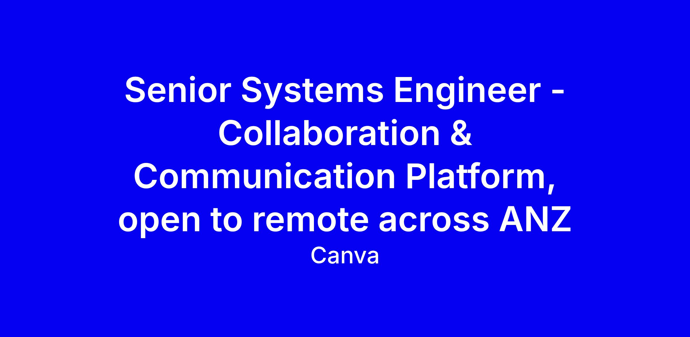 Canva is seeking a Senior Systems Engineer for the Collaboration & Communication Platform, open to remote across ANZ, to design and deliver cross‑platform experiences across Jira, Slack, Confluence, Google Workspace and Zoom, plus integrations via Workato and n8n, with a focus on user outcomes and platform reliability while reducing debt. You’ll partner with teams, own end‑to‑end architecture, mentor others, and codify knowledge through docs and demos. The ideal candidate has 5+ years in solution design and systems architecture, deep hands‑on expertise in collaboration tools, API savvy, scripting, and strong cross‑functional communication. To apply, tailor examples with measurable impact, highlight multi‑tool projects, and demonstrate a growth mindset; check lifeatcanva and note any adjustments or pronouns.