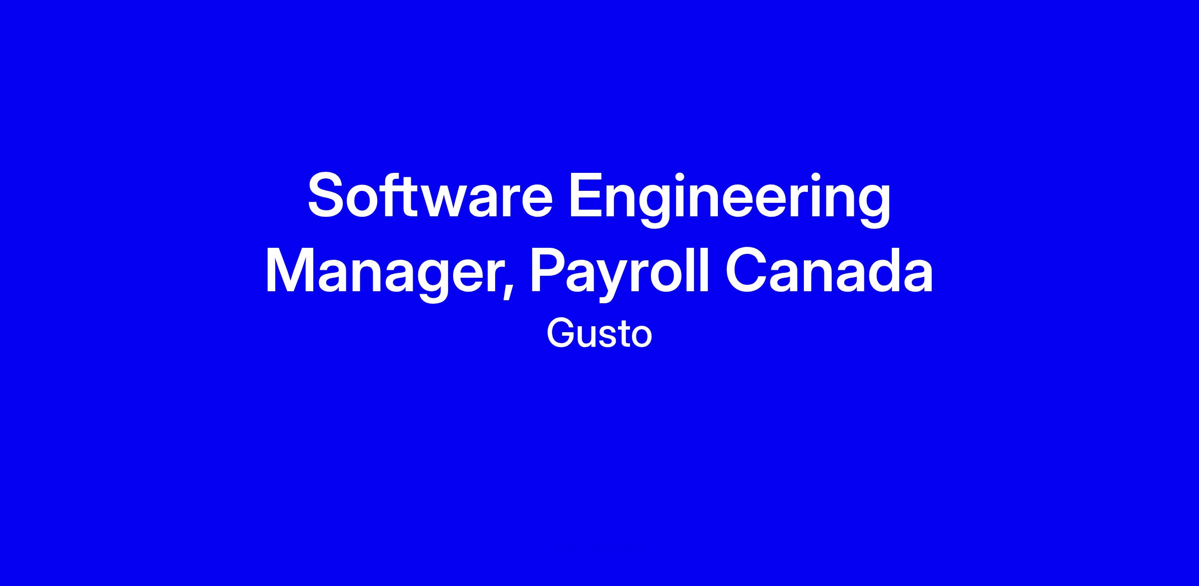 Gusto’s Software Engineering Manager, Payroll Canada is a leadership role building the Canadian payroll platform. You’ll lead a cross functional engineering team, set the API and data model direction, and ensure accuracy, compliance and scalability as the product expands. This role blends hands on leadership with strategic influence across Product and Design, guiding initiatives from concept to production. What matters most: 8+ years in software engineering, 2+ years as a people manager, a track record delivering high availability, compliant systems, and strong cross functional collaboration. Bonus: payroll fintech, multi currency, Kafka, RoR. To apply, submit a tailored resume and a brief note on how you will drive Canada payroll growth and partner with stakeholders.