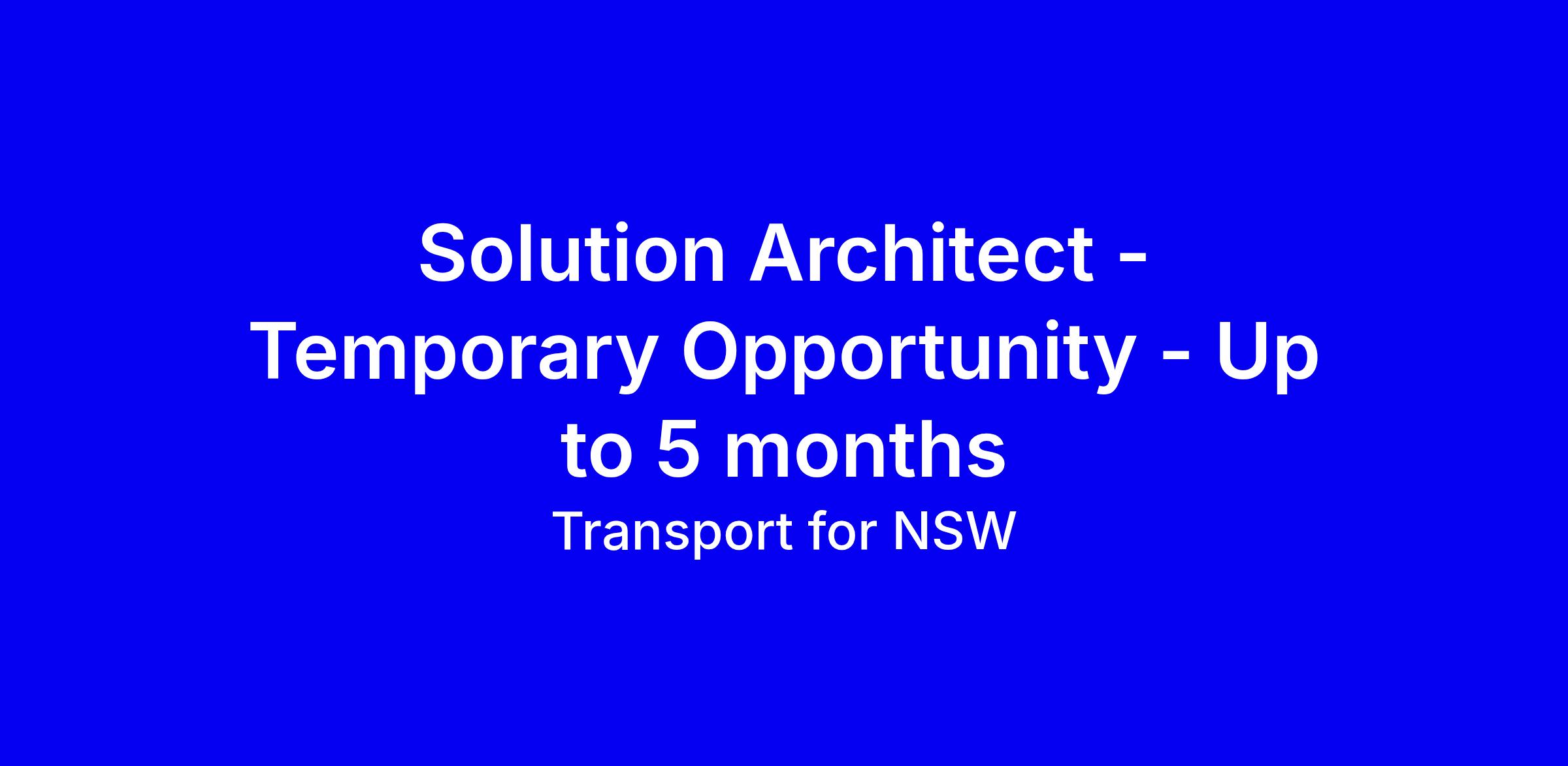 Transport for NSW is seeking a Solution Architect for a four month fixed-term, onsite in Macquarie Park, to shape and deliver high quality architectures for tolling solutions, improve business information access, strengthen governance and compliance, and ensure designs align with tolling platforms and operational requirements. You will translate strategic technology plans into practical solutions, construct applications and services, and build architecture models, standards and processes while collaborating with project teams across a dynamic multi-project environment. The ideal candidate brings tolling systems experience, strong analytical and stakeholder management skills, and a proven ability to turn business needs into clear designs. Apply by 11:59 PM 10th February 2026; contact [email protected].