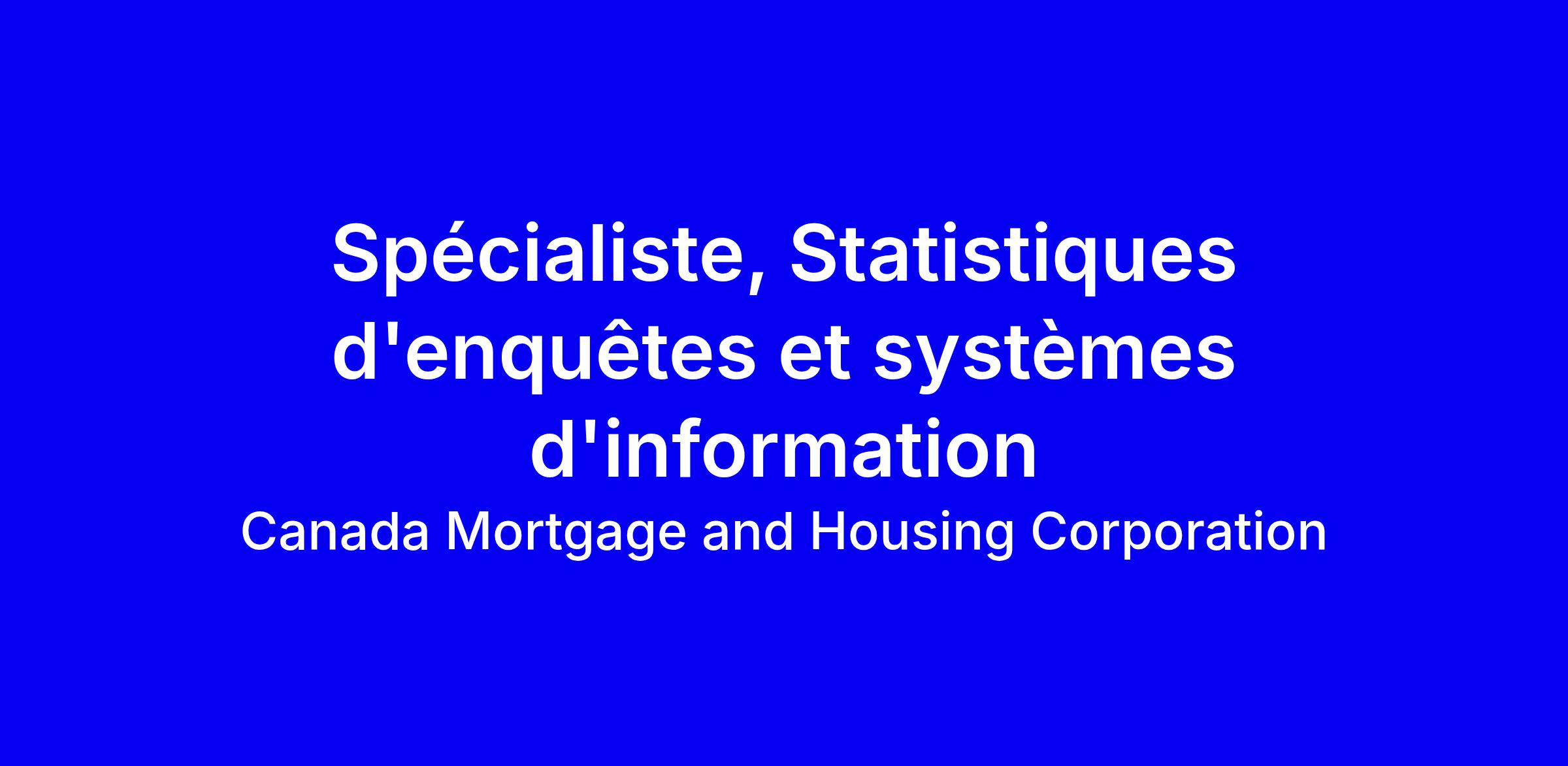 Joignez-vous à l’équipe Politiques, au poste de Spécialiste, Statistiques d'enquêtes et système. Vous serez responsable de l’élaboration, de la conception et de l’amélioration du cadreméthodologique des Enquêtes sur le marché du logement et des systèmes informatiques connexes afin derépondre aux besoins opérationnels de l’ensemble des régions et des secteurs de la SCHL. Vous fournirez desconseils et des orientations sur les méthodes statistiques et d’enquête pour la conception et la mise en oeuvre dessondages menés pour ou par la SCHL.