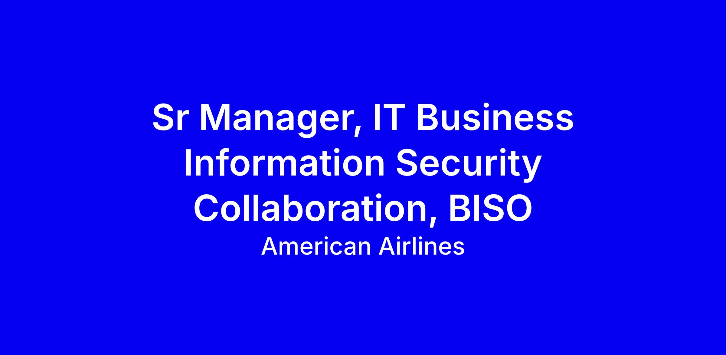 American Airlines seeks a Sr Manager IT BISO to partner with business units and align cybersecurity decisions with strategic goals. You will drive security strategy translate requirements into business terms and advocate secure by design while balancing risk. Ideal candidates hold a bachelor’s in computer science or information systems, 8+ years in IT, 3+ in cybersecurity, and experience advising senior leadership; strong communication to non technical audiences and at least 2 years in a leadership role. Familiarity with NIST CSF ISO 27001 TSA HIPAA GDPR PCI DSS and relevant certifications is preferred. Onsite Fort Worth TX. Apply with measurable security improvements and collaboration with business teams.