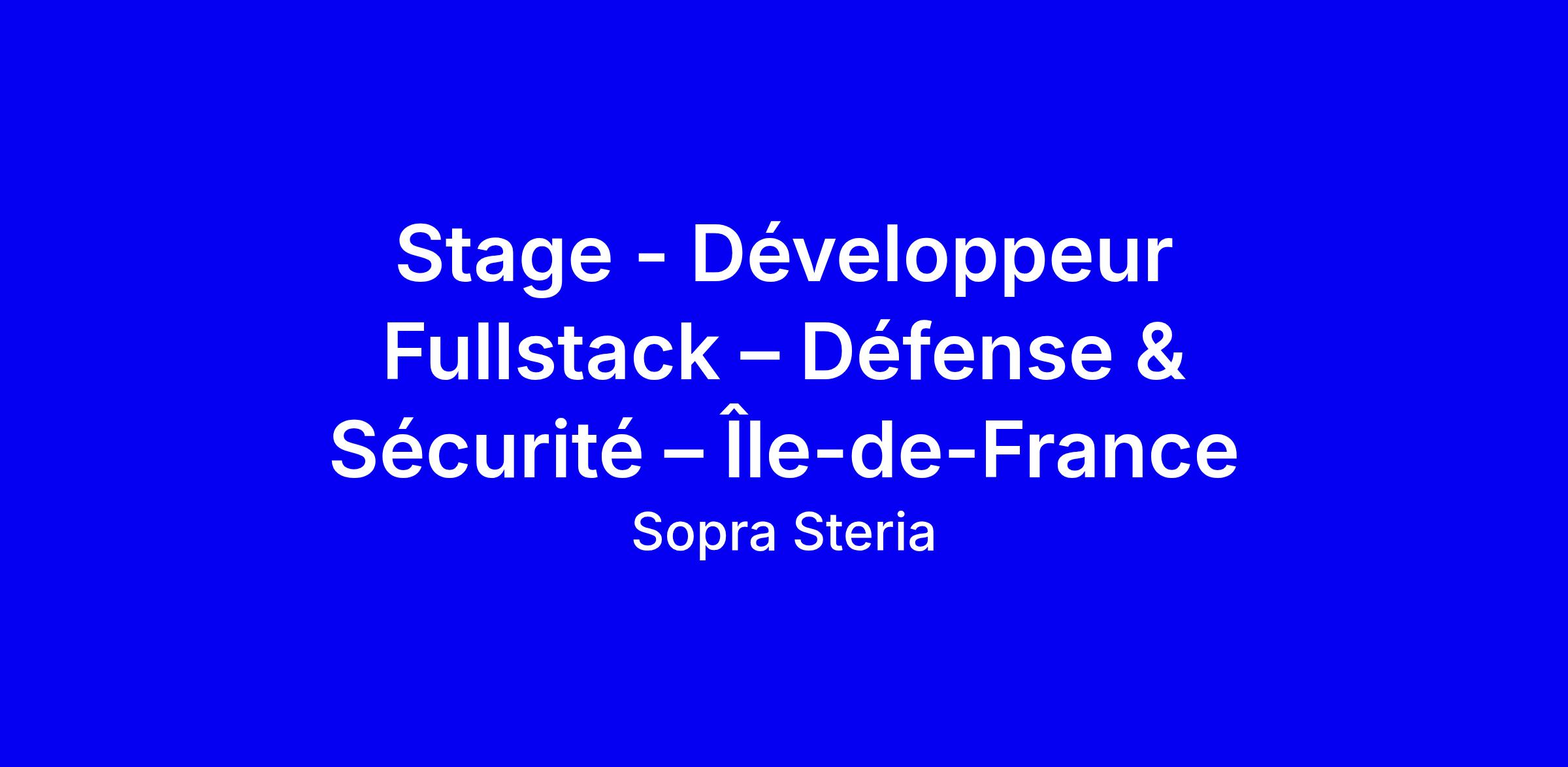 Stage Développeur Fullstack, Défense et Sécurité, Île-de-France, Courbevoie, sur site avec télétravail possible jusqu’à 2 jours par semaine. Étudiant en dernière année d’ingénierie ou équivalent, familiarisé avec Java, vous évoluez dans un cadre Agile sous la supervision d’un développeur expérimenté et concevez des solutions innovantes tout en développant sur plusieurs stacks. Rejoignez une communauté technique (Tech'Me UP) et bénéficiez de la Sopra Steria Academy, tout en travaillant sur des projets à forts enjeux sociétaux au service des ministères. Pour postuler, valorisez votre expérience Java et votre esprit d’équipe, votre curiosité technique et vos initiatives, et illustrez-les par des projets concrets et académiques.