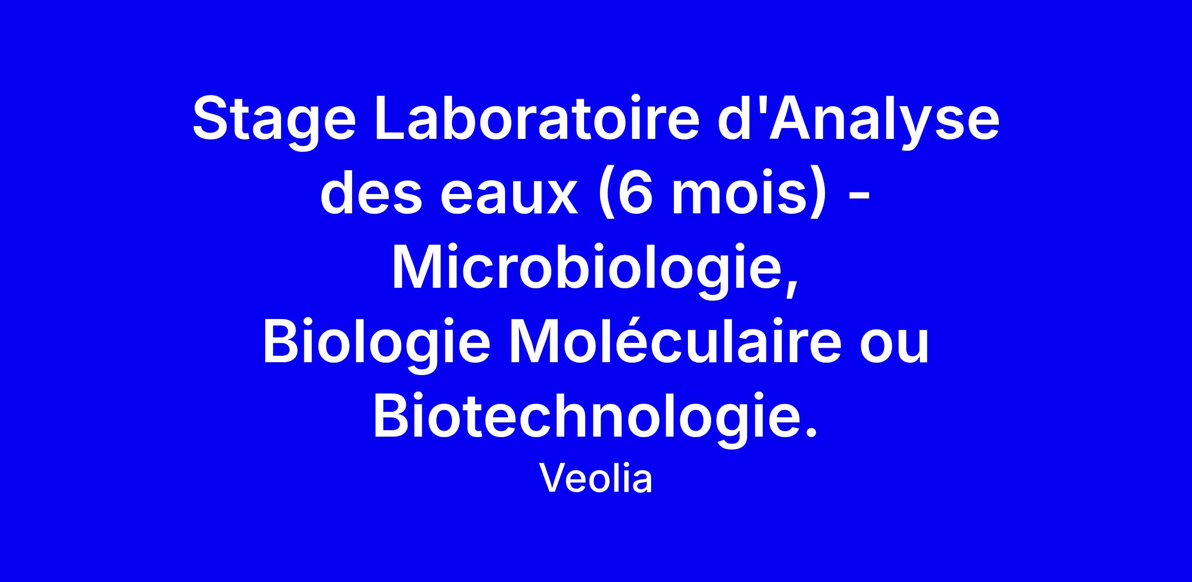 Le laboratoire d'analyses des eaux de baignade de Veolia Eau situé à La Garde recherche un.e stagiaire motivé.e pour une durée de 5 à 6 mois. Le stage s'adresse aux étudiants de niveau BUT, Licence ou Master en Microbiologie, Biologie Moléculaire ou Biotechnologie.