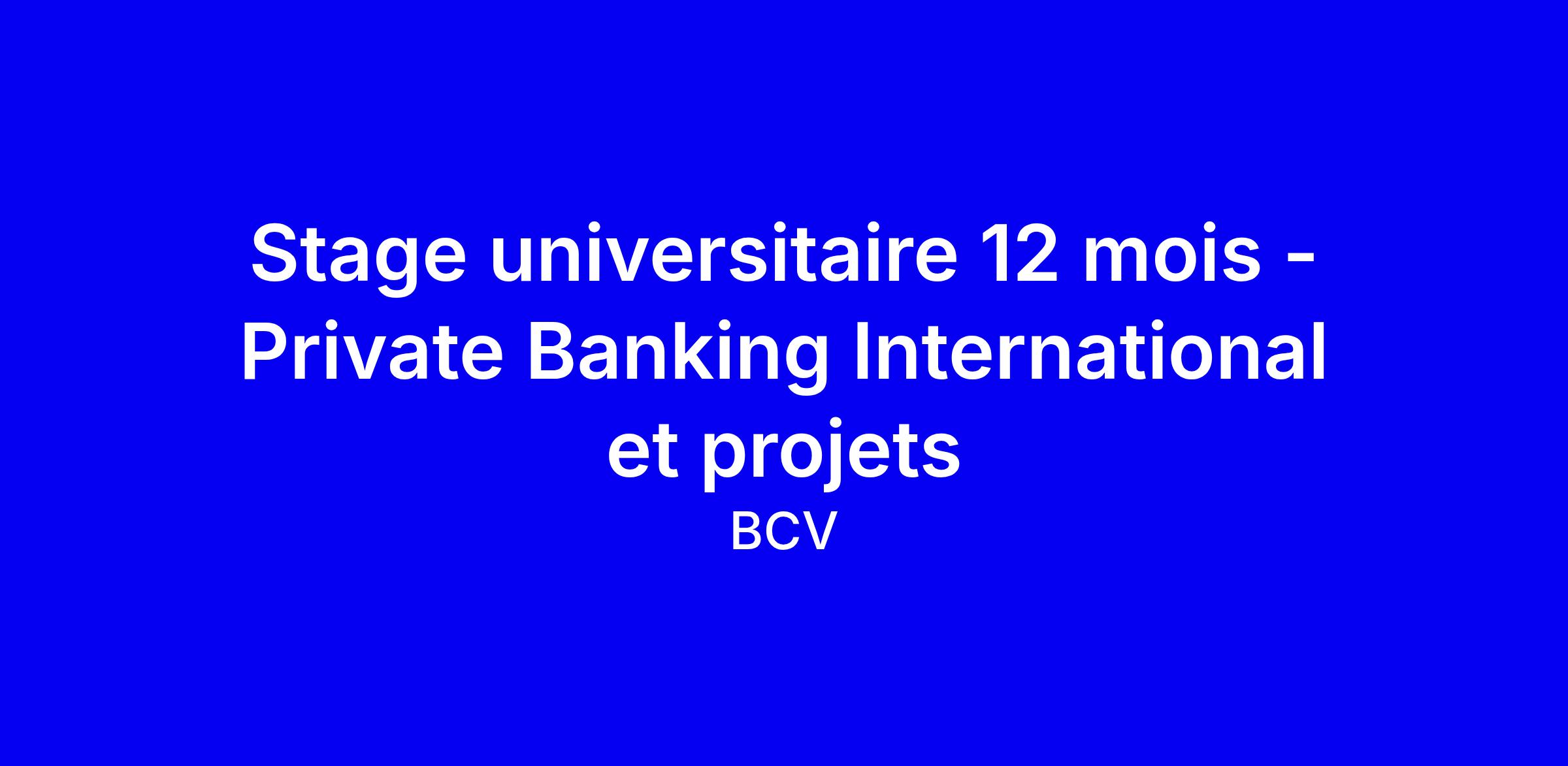Stage universitaire de 12 mois à Lausanne, VD, chez BCV dans Private Banking International et lEtat-Major Projets. Six mois dans Private Banking International pour soutenir les conseillers et réaliser des analyses, puis six mois dans lEtat-Major Projets pour contribuer aux projets et préparer les présentations. Profil recherché: bachelor ou master HEC ou EPFL, intérêt pour la banque, sens des projets, esprit dynamique et orienté solutions, solides capacités analytiques et de communication, aptitude à synthétiser des sujets complexes, maîtrise des outils usuels. Français langue maternelle, bonnes connaissances de l'anglais, allemand atout. Pour postuler, adaptez CV et lettre en présentant des projets concrets et des expériences d’analyse de données et de pilotage, et expliquez pourquoi BCV vous attire.